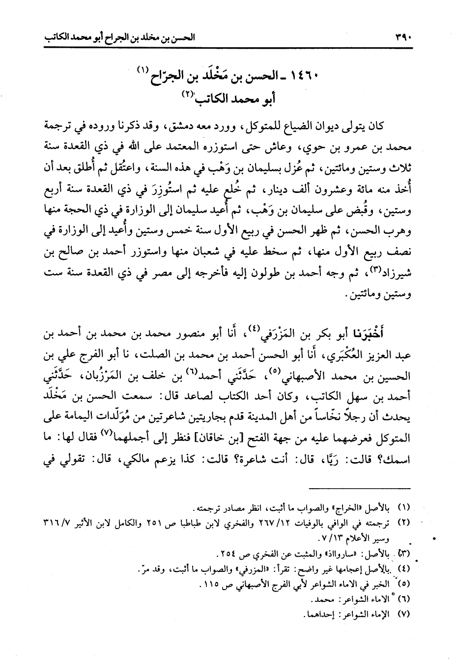 1460 - الحسن بن مخلد بن الجراح (1) أبو محمد الكاتب (2) كان يتولى ديوان الضياع للمتوكل وورد معه دمشق وقد ذكرنا وروده في ترجمة محمد بن عمرو بن حوي وعاش حتى استوزره المعتمد على الله في ذي القعدة سنة ثلاث وستين ومائتين ثم عزل بسليمان بن وهب في هذه السنة واعتقل ثم اطلق بعد أن اخذ منه مائة وعشرون ألف دينار ثم خلع عليه ثم استوزر في ذي القعدة سنة اربع وستين وقبض على سليمان بن وهب ثم اعيد سليمان إلى الوزارة في ذي الحجة منها وهرب الحسن ثم ظهر الحسن في ربيع الأول سنة خمس وستين واعيد إلى الوزارة في نصف ربيع الأول منها ثم سخط عليه في شعبان منها واستوزر احمد بن صالح بن شيرزاد (3) ثم جه احمد بن طولون إليه فاخرجه إلى مصر في ذي القعدة سنة ست وستين ومائتين اخبرنا أبو بكر بن المزرفي (4) أنا أبو منصور محمد بن محمد بن أحمد بن عبد العزيز العكبري أنا أبو الحسن احمد بن محمد بن الصلت نا أبو الفرج علي بن الحسين بن محمد الاصبهاني (5) حدثني احمد (6) بن خلف بن المرزبان حدثني احمد بن سهل الكاتب وكان أحد الكتاب لصاعد قال سمعت الحسن بن مخلد يحدث أن رجلا نخاسا من أهل المدينة قدم بجاريتين شاعرتين من مولدات اليمامة على المتوكل فعرضهما عليه من جهة الفتح بن خاقان فنظر إلى اجملهما (7) فقال لها ما اسمك قالت ريا قال أنت شاعرة قالت كذا يزعم مالكي قال تقولي في