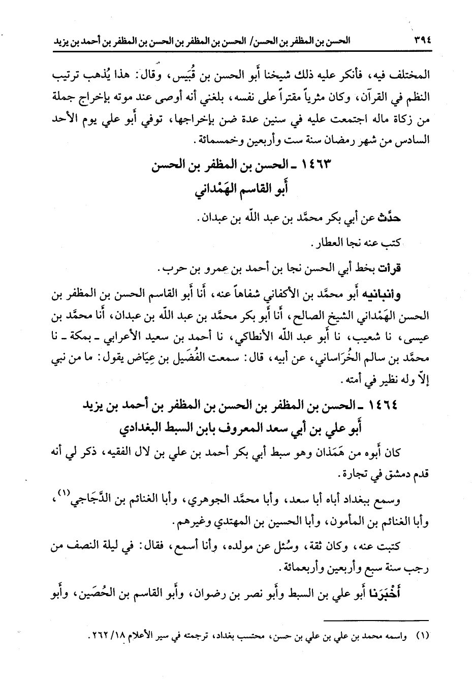 1463 - الحسن بن المظفر بن الحسن أبو القاسم الهمداني حدث عن أبي بكر محمد بن عبد الله بن عبدان كتب عنه نجا العطار قرأت بخط أبي الحسن نجا بن احمد بن عمرو بن حرب وانبأنيه أبو محمد بن ألا كفاني شفاها عنه أنا أبو القاسم الحسن بن المظفر بن الحسن الهمداني الشيخ الصالح أنا أبو بكر محمد بن عبد الله بن عبدان أنا محمد بن عيسى نا شعيب نا أبو عبد الله الانطاكي نا حمد بن سعيد الأعرابي بمكة نا محمد بن سالم الخراساني عن أبيه قال سمعت الفضيل بن عياض يقول ما من نبي إلا وله نظير في امته