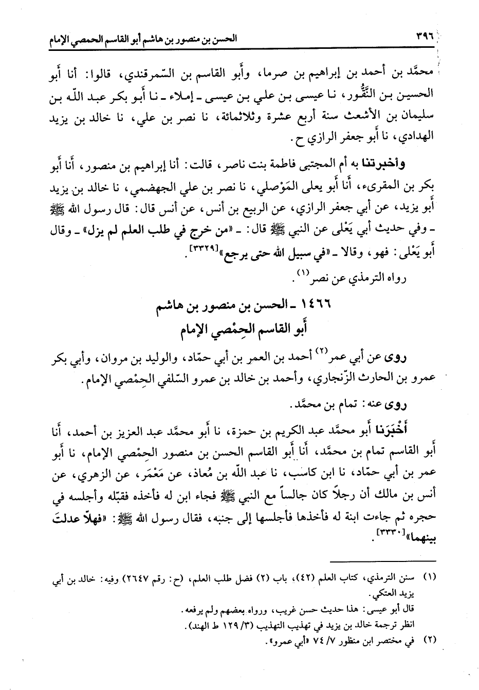1466 - الحسن بن منصور بن هاشم أبو القاسم الحمصي الأمام روى عن أبي عمر (2) احمد بن العمر بن أبي حماد والوليد بن مروان وأبي بكر عمرو بن الحارث الزنجاري واحمد بن خالد بن عمرو السلفي الحمصي الأمام روى عنه تمام بن محمد اخبرنا أبو محمد عبد الكريم بن حمزة نا أبو محمد عبد العزيز بن احمد أنا أبو القاسم تمام بن محمد أنا أبو القاسم الحسن بن منصور الحمصي الأمام نا أبو عمر بن أبي حماد نا ابن كاسب نا عبد الله بن معاذ عن معمر عن الزهري عن انس بن مالك أن رجلا كان جالسا مع النبي (صلى الله عليه وسلم) فجاء ابن له فأخذه فقبله واجلسه في حجره ثم جاءت ابنة له فأخذها فأجلسها إلى جنبه فقال رسول الله (صلى الله عليه وسلم) فهلا عدلت بينهما