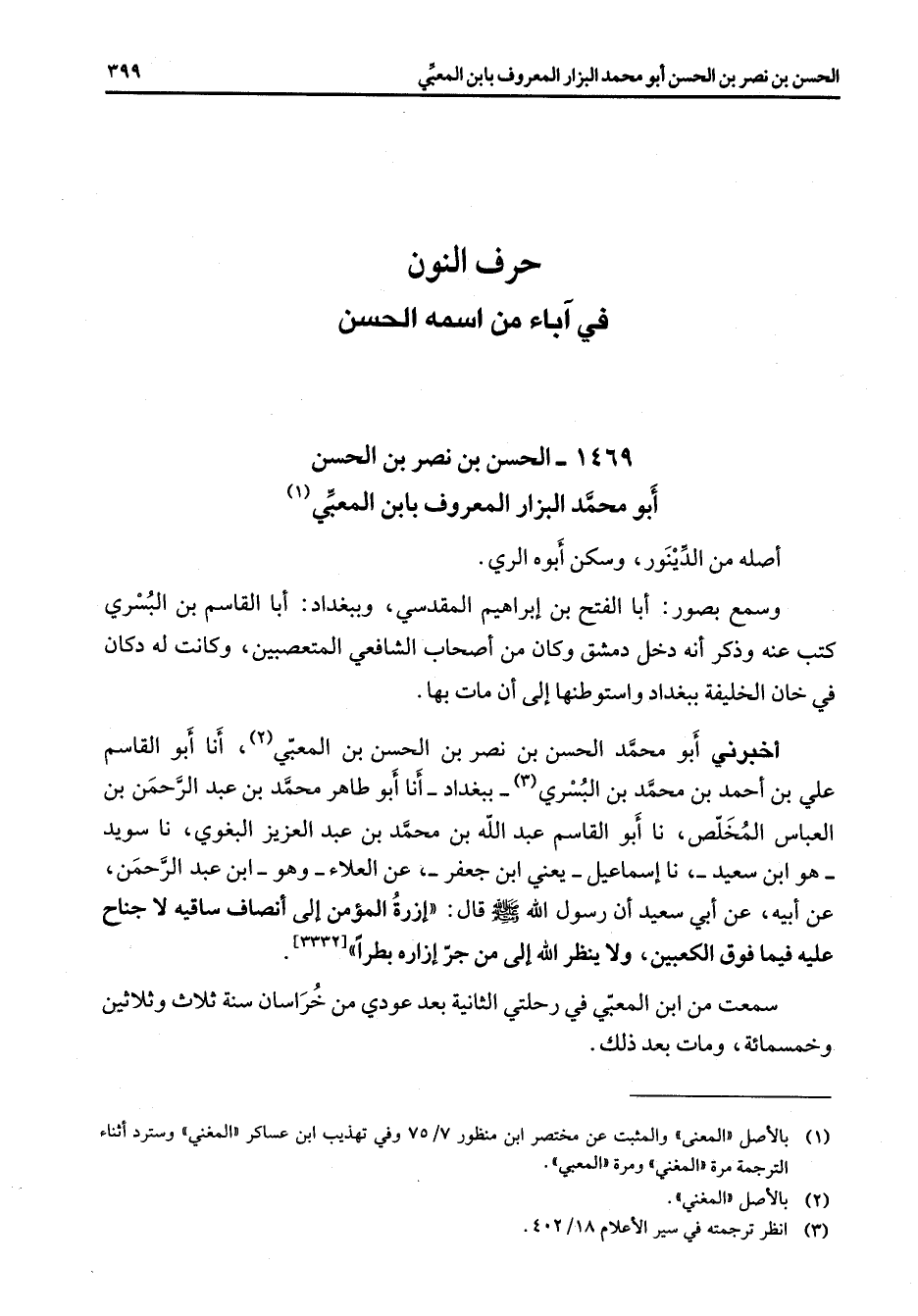 1469 - الحسن بن نصر بن الحسن أبو محمد البزار المعروف بابن المعبي (1) اصله من الدينور وسكن أبوه الري وسمع بصور أبا الفتح بن إبراهيم المقدسي وببغداد أبا القاسم بن البسري كتب عنه وذكر انه دخل دمشق وكان من أصحاب الشافعي المتعصبين وكانت له دكان في خان الخليفة ببغداد واستوطنها إلى أن مات بها اخبرني أبو محمد الحسن بن نصر بن الحسن بن المعبي (2) أنا أبو القاسم علي بن احمد بن محمد بن البسري (3) ببغداد أنا أبو طاهر محمد بن عبد الرحمن بن العباس المخلص نا أبو القاسم عبد الله بن محمد بن عبد العزيز البغوي نا سويد هو ابن سعيد نا إسماعيل يعني ابن جعفر عن العلاء وهو ابن عبد الرحمن عن أبيه عن أبي سعيد أن رسول الله (صلى الله عليه وسلم) قال إزرة المؤمن إلى انصاف ساقيه لا جناح عليه فيما فوق الكعبين ولا ينظر الله إلى من جر ازاره بطرا سمعت من ابن المعبي في رحلتي الثانية بعد عودي من خراسان سنة ثلاث وثلاثين وخمسمائة ومات بعد ذلك