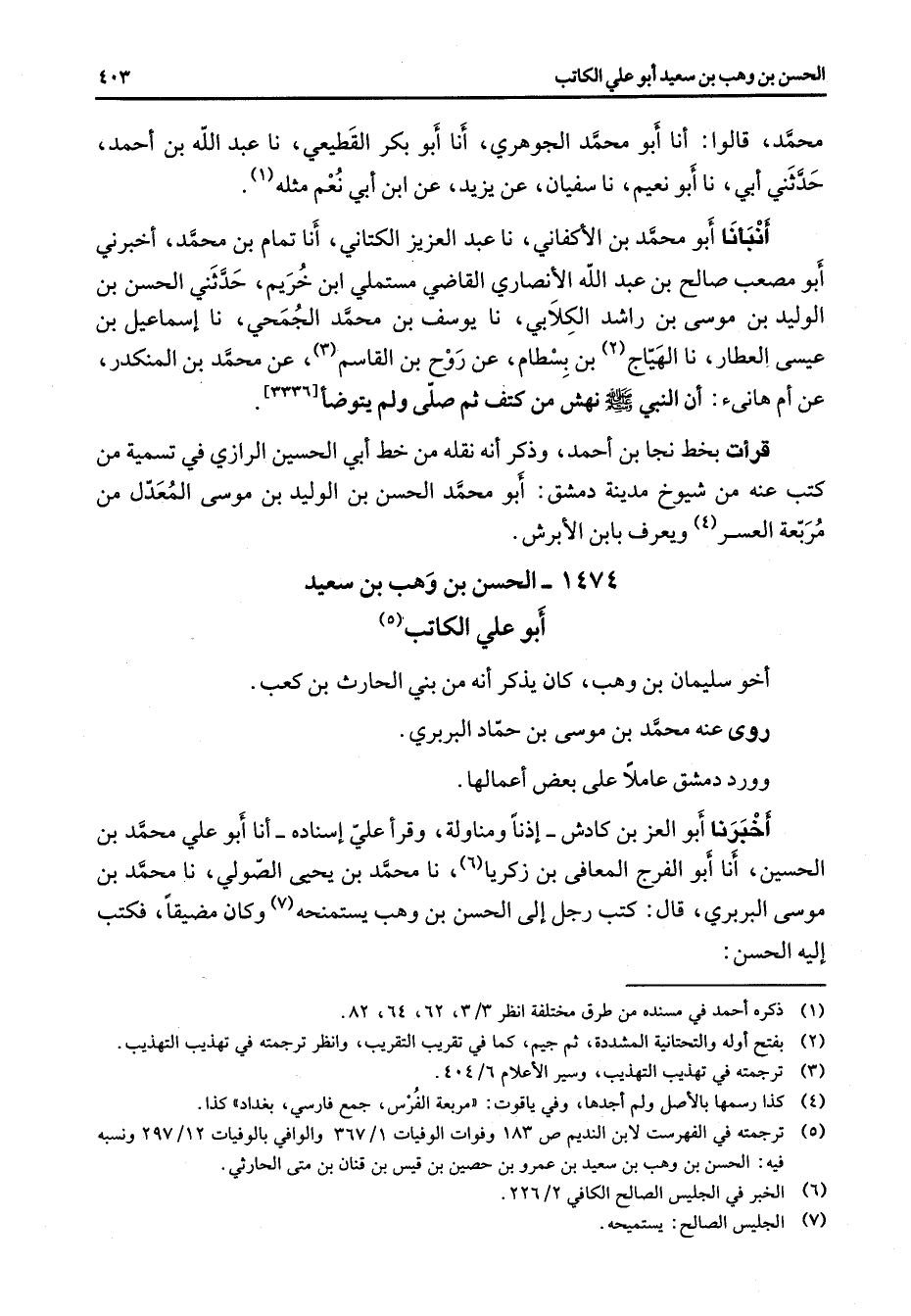 أنبأنا أبو محمد ألا كفاني نا عبد العزيز الكتاني أنا تمام بن محمد اخبرني أبو مصعب صالح بن عبد الله الأنصاري القاضي مستملي ابن خريم حدثني الحسن بن الوليد بن موسى بن راشد الكلابي نا يوسف بن محمد الجمحي نا إسماعيل بن عيسى العطار نا الهياج (2) بن بسطام عن روح بن القاسم (3) عن محمد بن المنكدر عن أم هانئ أن النبي (صلى الله عليه وسلم) نهش من كتف ثم صلى ولم يتوضأ قرأت بخط نجا بن احمد وذكر انه نقله من خط أبي الحسين الرازي في تسمية من كتب عنه من شيوخ مدينة دمشق أبو محمد الحسن بن الوليد بن موسى المعدل من مربعة العسر (4) ويعرف بابن الابرش