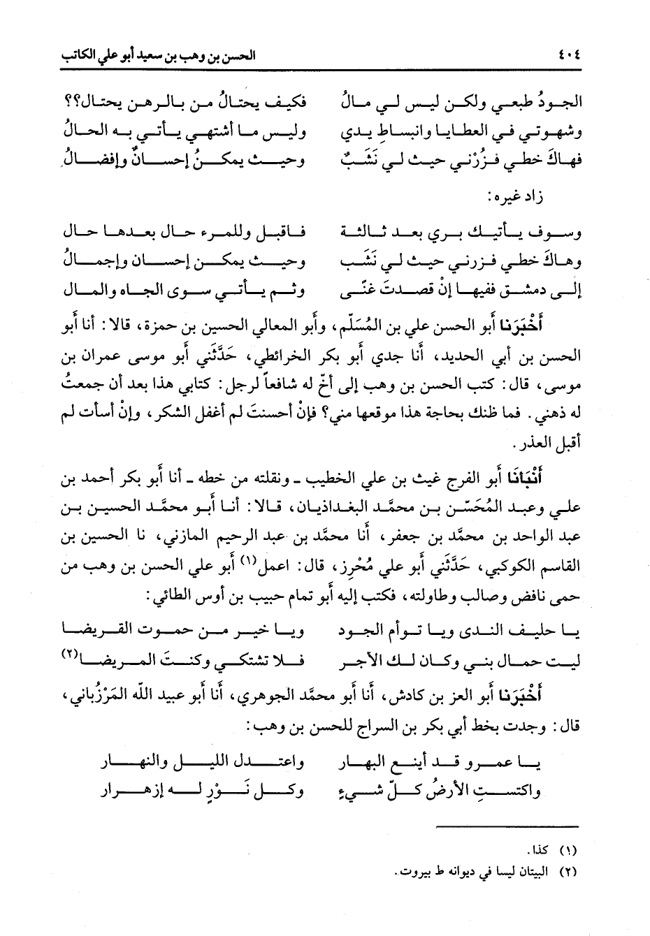 * الجود طبعي ولكن ليس لي مال * فكيف يحتال من بالرهن يحتال وشهوتي في العطايا وانبساط يدي * وليس ما اشتهي يأتي به الحال فهاك خطي فزرني حيث نشب * وحيث يمكن احسان وافضال * زاد غيره: * وسوف ياتيك بري بعد ثالثة * فاقبل وللمرء حال بعدها حال وهاك خطي فزرني حيث لي نشب * وحيث يمكن احسان واجمال إلى دمشق ففيها أن قصدت غنى * وثم يأتي سوى الجاه والمال * اخبرنا أبو الحسن علي بن المسلم وأبو المعالي الحسين بن حمزة قالا أنا أبو الحسن بن أبي الحديد أنا جدي أبو بكر الخرائطي حدثني أبو موسى عمران بن موسى قال كتب الحسن بن وهب إلى أخ له شافعا لرجل كتابي هذا بعد أن جمعت له ذهني فما ظنك بحاجة هذا موقعها مني فإن أحسنت لم اغفل الشكر وان اسأت لم اقبل العذر أنبأنا أبو الفرج غيث بن علي الخطيب ونقلته من خطه أنا أبو بكر احمد بن علي وعبد المحسن بن محمد البغداذيان قالا أنا أبو محمد الحسين بن عبد الواحد بن محمد بن جعفر أنا محمد بن عبد الرحيم المازني نا الحسين بن القاسم الكوكبي حدثني أبو علي محرز قال اعمل (1) أبو علي الحسن بن وهب من حمى نافض وصالب وطاولته فكتب إليه أبو تمام حبيب بن اوس الطائي: * يا حليف الندى ويا توأم الجود * ويا خير من حموت القريضا ليت حمال بني وكان لك الاجر * فلا تشتكي وكنت المريضا (2) * اخبرنا أبو العز بن كادش أنا أبو محمد الجوهري أنا أبو عبيد الله المرزباني قال وجدت بخطر أبي بكر بن السراج للحسن بن وهب: * يا عمرو قد اينع البهار * واعتدل الليل والنهار واكتست الأرض كل شئ * وكل نور له ازهرار