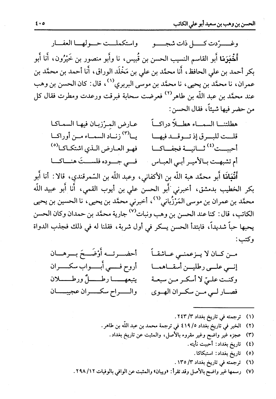 وغردت كل ذات شجو * واستكملت حولها العفار * اخبرنا أبو القاسم النسيب الحسن بن قبيس نا وأبو منصور بن خيرون أنا أبو بكر احمد بن علي الحافظ أنا محمد بن علي بن مخلد الوراق أنا احمد بن محمد بن عمران نا محمد بن يحيى نا محمد بن موسى البربري (1) قال كان الحسن بن وهب عند محمد بن عبد الله بن طاهر (2) فعرضت سحابة فبرقت ورعدت ومطرت فقال كل من حضر فيها شيئا فقال الحسن: * هطلتنا السماء هطلا دراكا * عارض المرزبان فيها السماكا قلت للبرق إذ توقد فيها * يا (3) زناد السماء من اوراكا احببت (4) ثانية فجفاكا * فهو العارض الذي اشتكاكا (5) أم تشبهت بالأمير أبي العباس * في جوده فلست هناكا * أنبأنا أبو محمد هبة الله بن ألا كفاني وعبد الله بن السمرقندي قالا أنا أبو بكر الخطيب بدمشق اخبرني أبو الحسن علي بن أيوب القمي أنا عبيد الله محمد بن عمران بن موسى المرزباني (6) اخبرني محمد بن يحيى نا الحسين بن يحيى الكاتب قال كنا عند الحسن بن وهب ونبات (7) جارية محمد بن حمدان وكان الحسن يحبها حبا شديدا فابتدأ الحسن يسكر في أول شربة فقلنا له في ذلك فجذب الدواة وكتب: * من كان لا يزعمني عاشقا * اخضرته اوضح برهان أني على رطلين اسقاهما * اروح في أبواب سكران وكنت علي لا اسكر من سبعة * يتبعها رطل ورطلان فصار لي من سكران الهوى * والراح سكران عجيبان *