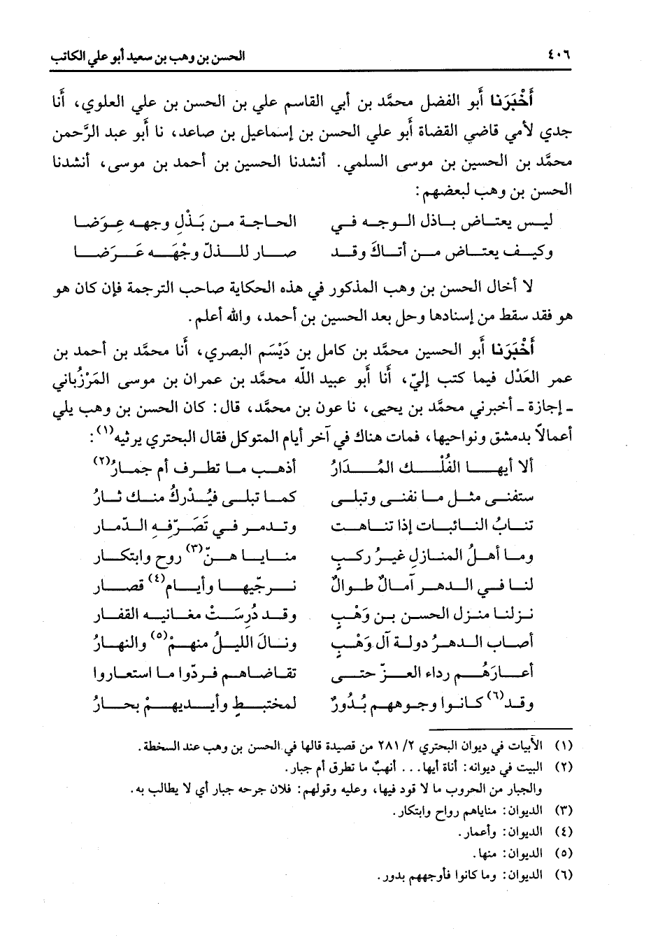 اخبرنا أبو الفضل محمد بن أبي القاسم علي بن الحسن بن علي العلوي أنا جدي لامي قاضي القضاة أبو علي الحسن بن إسماعيل بن صاعد نا أبو عبد الرحمن محمد بن الحسين بن موسى السلمي انشدنا الحسين بن احمد بن موسى انشدنا الحسن بن وهب لبعضهم: * ليس يعتاض باذل الوجه في * الحاجة من بذل وجهه عوضا وكيف يعتاض من اتاك وقد * صار للذل وجهه عرضا * لا اخال الحسن بن وهب المذكور في هذه الحكاية صاحب الترجمة فإن كان هو هو فقد سقط من اسنادها وحل بعد الحسين بن احمد والله اعلم اخبرنا أبو الحسين محمد بن كامل بن ديسم البصري أنا محمد بن احمد بن عمر العدل فيما كتب الي أنا أبو عبيد الله محمد بن عمران بن موسى المرزباني اجازة اخبرني محمد بن يحيى نا عون بن محمد قال كان الحسن بن وهب يلي اعمالا بدمشق ونواحيها فمات هناك في آخر أيام المتوكل فقال البحتري يرثيه (1) : * إلا أيها الفلك المدار * اذهب ما تطرف أم جمار (2) ستفنى مثل ما نفنى وتبلى * كما تبلى فيدرك منك ثأر تناب النائبات إذا تناهت * وتدر في تصرفه الدمار وما أهل المنازل غير ركب * مناياهن (3) روح وابتكار لنا في الدهر آمال طوال * نرجيها وايام (4) قصار نزلنا منزل الحسن بن وهب * وقد درست مغانيه القفار اصاب الدهر دولة آل وهب * ونال الليل منهم (5) والنهار اعارهم رداء العز حتى * تقاضاهم فردوا ما استعاروا وقد (6) كانوا وجوههم بدور * بمختبط وايديهم بحار *