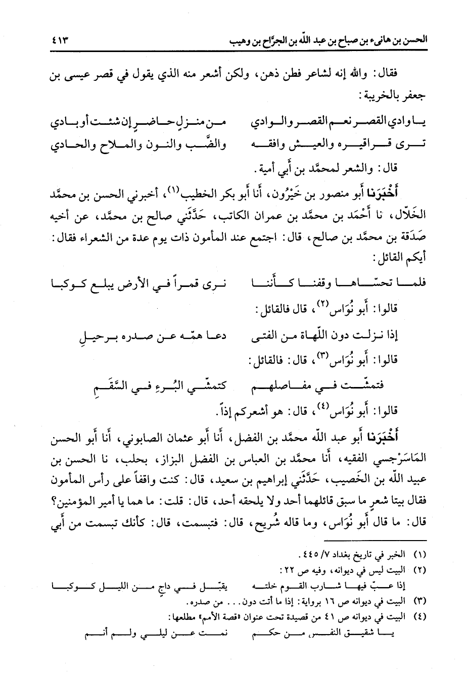 فقال والله انه لشاعر فطن ذهن ولكن اشعر منه الذي يقول في قصر عيسى بن جعفر بالخريبة: * يا وادي القصر نعم القصر والوادي * من منزل حاضر أن شئت أو بادي ترى قراقيره والعيش وافقه * والضب والنون والملاح والحادي * قال والشعر لمحمد بن أبي أمية اخبرنا أبو منصور بن خيرون أنا أبو بكر الخطيب (1) اخبرني الحسن بن محمد الخلال نا احمد بن محمد بن عمران الكاتب حدثني صالح بن محمد عن أخيه صدقة بن محمد بن صالح قال اجتمع عند المأمون ذات يوم عدة من الشعراء فقال ايكم القائل: * فلما تحساها وقفنا كأننا * نرى قمرا في الأرض يبلغ كوكبا * قالوا أبو نواس (2) قال فالقائل: * إذا نزلت دون اللهاة من الفتى * دعاهمه عن صدره برحيل * قالوا أبو نواس (3) قال فالقائل: * فتمشت في مفاصلهم * كتمشي البرء في السقم * قالوا أبو نواس (4) قال هو اشعركم إذا اخبرنا أبو عبد الله محمد بن الفضل أنا أبو عثمان الصابوني أنا أبو الحسن الماسرجسي الفقيه أنا محمد بن العباس بن الفضل البزاز بحلب نا الحسن بن عبيد الله بن الخصيب حدثني إبراهيم بن سعيد قال كنت واقفا على رأس المأمون فقال بيتا شعر ما سبق قائلهما أحد ولا يلحقه أحد قال قلت ما هما يا أمير المؤمنين قال ما قال أبو نواس وما قاله شريح قال فتبسمت قال كأنك تبسمت من أبي