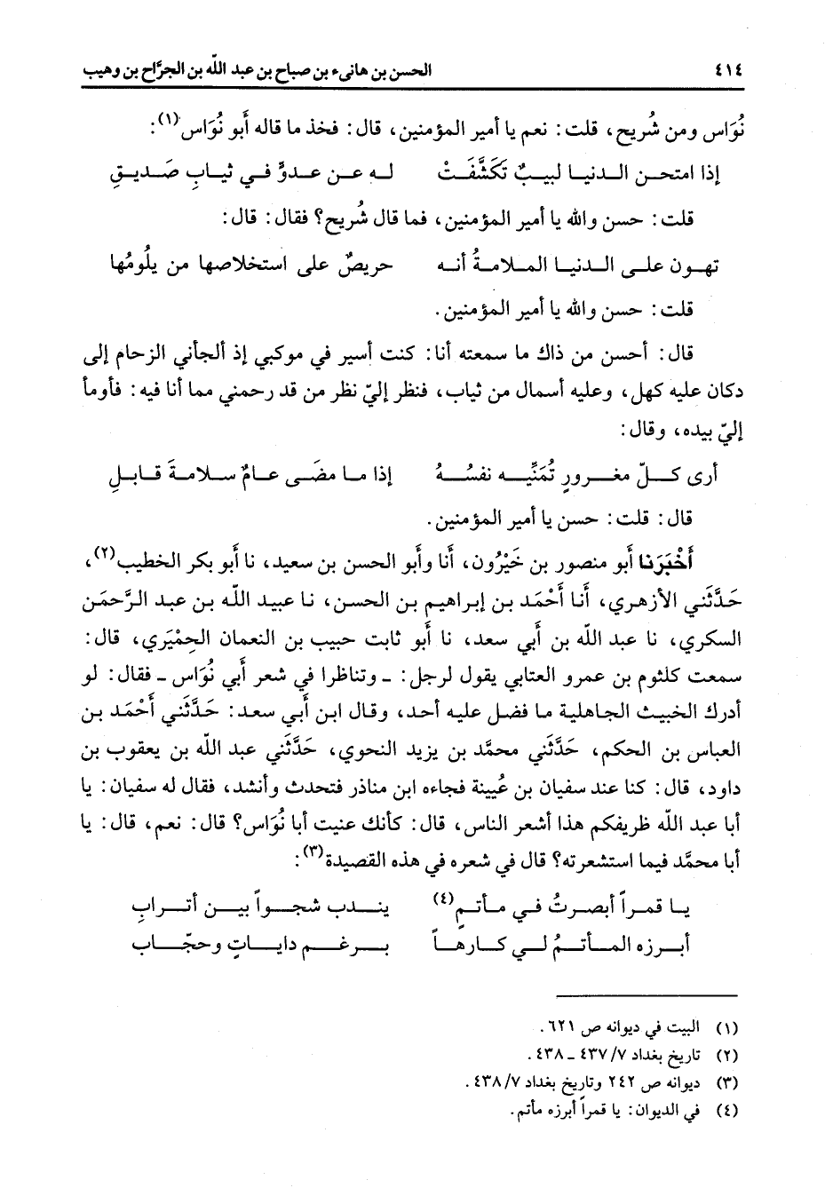 نواس ومن شريح قلت نعم يا أمير المؤمنين قال فخذ ما قاله أبو نواس (1) : * إذا امتحن الدنيا لبيب تكشفت * له عن عدو في ثياب صديق * قلت حسن والله يا أمير المؤمنين فما قال شريح فقال: قال: * تهون على الدنيا الملامة انه * حريص على استخلاصها من يلومها * قلت حسن والله يا أمير المؤمنين قال احسن من ذاك ما سمعته أنا كنت اسير في موكبي إذ الجأني الزحام إلى دكان عليه كهل وعليه اسمال من ثياب فنظر الي نظر من قد رحمني مما أنا فيه فأومأ ألي بيده وقال: * ارى كل مغرور تمنيه نفسه * إذا ما مضى عام سلامة قابل * قال قلت حسن يا أمير المؤمنين اخبرنا أبو منصور بن خيرون أنا وأبو الحسن بن سعيد نا أبو بكر الخطيب (2) حدثني الازهري أنا احمد بن إبراهيم بن الحسن نا عبيد الله بن عبد الرحمن السكري نا عبد الله بن أبي سعد نا أبو ثابت حبيب بن النعمان الحميري قال سمعت كلثوم بن عمرو العتابي يقول لرجل وتناظرا في شعر أبي نواس فقال لو أدرك الخبيث الجاهلية ما فضل عليه أحد وقال ابن أبي سعد حدثني احمد بن العباس بن الحكم حدثني محمد بن يزيد النحوي حدثني عبد الله بن يعقوب بن داود قال كنا عند سفيان بن عيينة فجاءه ابن مناذر فتحدث وانشد فقال له سفيان يا أبا عبد الله ظريفكم هذا اشعر الناس قال كأنك عنيت أبا نواس قال نعم قال يا أبا محمد فيما استشعرته قال في شعره في هذه القصيدة (3) : * يا قمرا أبصرت في مأتم (4) * يندب شجوا بين اتراب أبرزه المأتم لي كارها * برغم دايات وحجاب