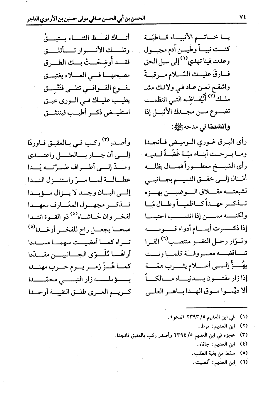 * يا خاتم الأنبياء قاطبة * أتاك لفظ الثناء يستبق كنت نبيا وطين آدم مجبول * وتلك الأنوار تأتلق وعدت فينا تهدي (1) إلى سبل الحق * فقد أوضحت بك الطرق * * فارق عليك السلام مرقبة * مصبحها في العلاء يغتبق واشفع لمن عاد في ولائك مش * فوع القوافي تتلى فتتسق ملك (2) أليفاظه التي انتظمت * يطيب علياك في الورى عبق تضوع من مجدك الأثيل إذا * استفيض ذكر أطيب فينتشق * وأنشدنا في مدحه (صلى الله عليه وسلم) : * رأى البرق غوري الوميض فأنجدا * وأصدر (3) ركب في بالعقيق فاوردا وما برحت أبناء مية غضة لديه * إلى أن جار بالعقل واعتدى رأى الشيخ ممطورا فمال بظله * ومد إلى أطراف طرته يدا أمال إلى خفق النسيم بجانبي * عطالة لما مر واستنزل الندا لشبعته مقلاق الوضين يهزه * إلى البان وجد لا يزال مؤبدا تذكر عهدا كاظميا وطال ما * تذكر مجهول المعارف معهدا ولكنه ممن إذا انتسب احتبا * لفخر وإن حاشاه (4) ذو القوة انتدا إذا ذكرت أيام أدواء قومه * صحا يجعل راح للفخر أو غدا (5) وموار رحل النضو منتصب (6) القرا * تراه كما أمضيت سهما مسددا تناقضه معروفة كلما ونت * أراها ملوى الجانبين مقددا يهز إلى أعلام يثرب همة * كما هز زمر يوم حرب مهندا إذا زار مفتون بدنياه مالكا * يؤمله زار النبي محمدا ألا ديموا موق الهدا باهرا العلى * كريم العرى طلق النقيبة أوحدا