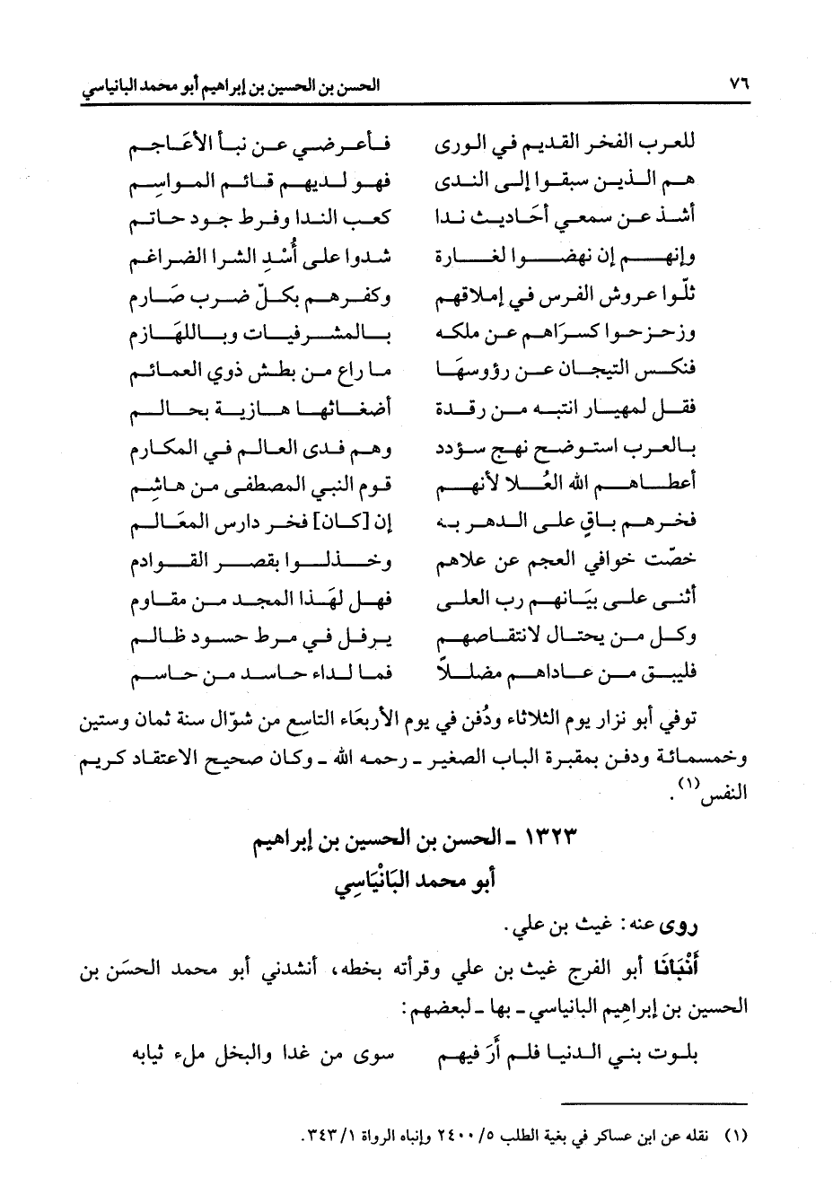 1323 - الحسن بن الحسين بن إبراهيم أبو محمد البانياسي روى عنه غيث بن علي أنبأنا أبو الفرج غيث بن علي وقرأته بخطه أنشدني أبو محمد الحسن بن الحسين بن إبراهيم البانياسي بها لبعضهم: * بلوت بني الدنيا فلم أر فيهم * سوى من غدا والبخل ملء ثيابه