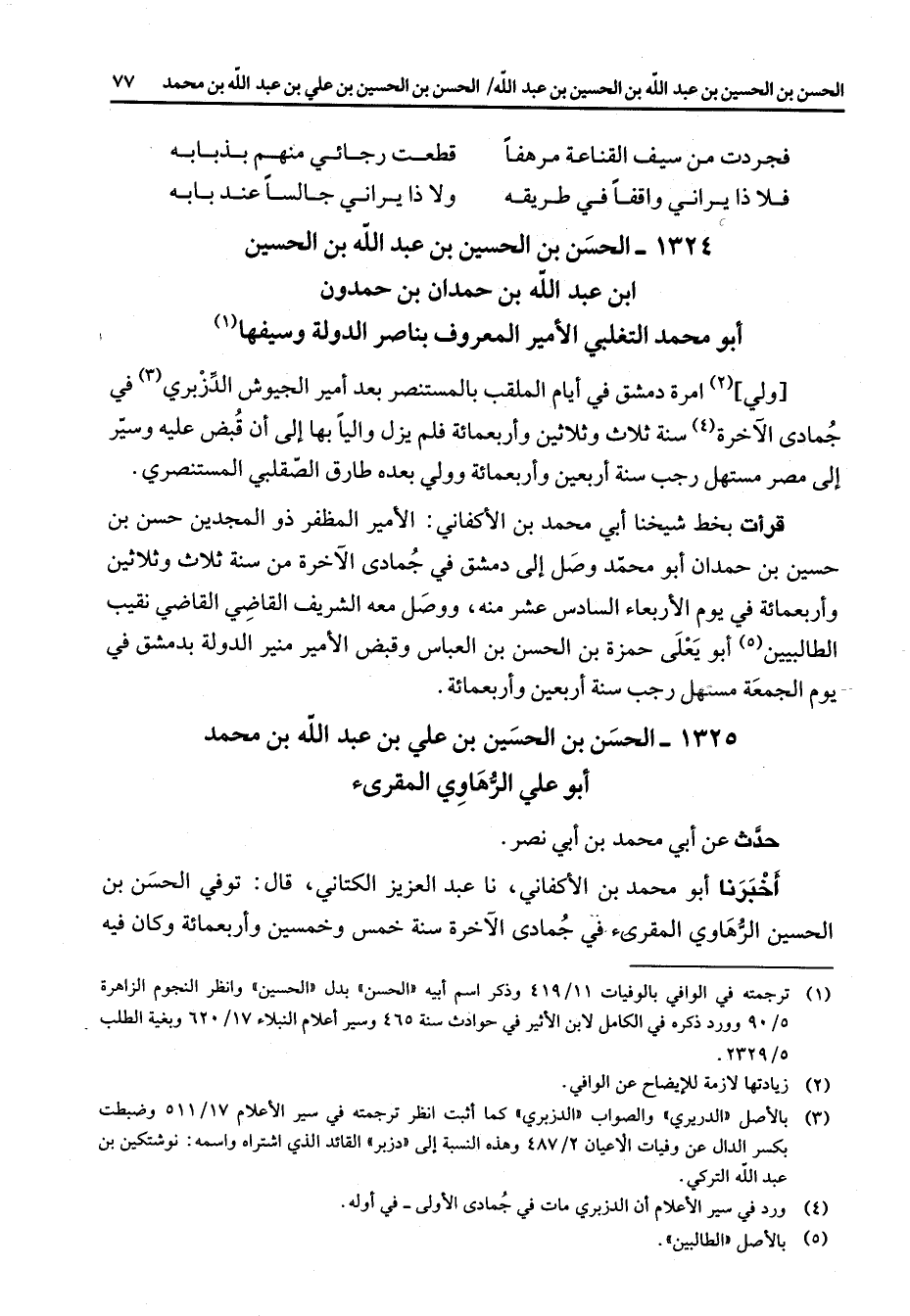 فجردت من سيف القناعة مرهفا * قطعت رجائي منهم بذبابه فلا ذا يراني واقفا في طريقه * ولا ذا يراني جالسا عند بابه * 1324 - الحسن بن الحسين بن عبد الله بن الحسين ابن عبد الله بن حمدان بن حمدون أبو محمد التغلبي الأمير المعروف بناصر الدولة وسيفها (1) ولي (2) إمرة دمشق في أيام الملقب بالمستنصر بعد أمير الجيوش الدزبري (3) في جمادى الآخرة (4) سنة ثلاث وثلاثين وأربعمائة فلم يزل واليا بها إلى أن قبض عليه وسير إلى مصر مستهل رجب سنة أربعين وأربعمائة وولي بعده طارق الصقلبي المستنصري قرأت بخط شيخنا أبي محمد بن الأكفاني الأمير المظفر ذو المجدين حسن بن حسين بن حمدان أبو محمد وصل إلى دمشق في جمادى الآخرة من سنة ثلاث وثلاثين وأربعمائة في يوم الأربعاء السادس عشر منه ووصل معه الشريف القاضي القاضي نقيب الطالبيين (5) أبو يعلى حمزة بن الحسن بن العباس وقبض الأمير منير الدولة بدمشق في يوم الجمعة مستهل رجب سنة أربعين وأربعمائة 1325 الحسن بن الحسين بن علي بن عبد الله بن محمد أبو علي الرهاوي المقرئ حدث عن أبي محمد بن أبي نصر أخبرنا أبو محمد بن الأكفاني نا عبد العزيز الكتاني قال توفي الحسن بن الحسين الرهاوي المقرئ في جمادى الآخرة سنة خمس وخمسين وأربعمائة وكان فيه