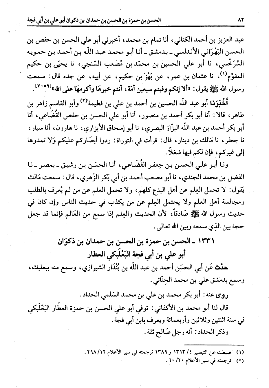 عبد العزيز بن أحمد الكتاني أنا تمام بن محمد أخبرني أبو علي الحسن بن حفص بن الحسن البهراني الأندلسي بدمشق أنا أبو محمد عبد الله بن أحمد بن حمويه السرخسي نا أبو علي الحسين بن محمد بن مصعب السنجي نا يحيى بن حكيم المقوم (1) نا عثمان بن عمر عن بهز بن حكيم عن أبيه عن جده قال سمعت رسول الله (صلى الله عليه وسلم) يقول ألا إنكم وفيتم سبعين أمة أنتم خيرها وأكرمها على الله أخبرنا أبو عبد الله الحسين بن أحمد بن علي بن فطيمة (2) وأبو القاسم زاهر بن طاهر قالا أنا أبو بكر أحمد بن منصور أنا أبو علي الحسن بن حفص القضاعي أنا أبو بكر أحمد بن عبد الله البزاز البصري نا أبو إسحاق الأبزاري نا هارون أنا سيار نا جعفر نا مالك بن دينار قال قرأت في التوراة ردوا أبصاركم عليكم ولا تمدوها إلى غيركم فإن لكم فيها شغلا ونا أبو علي الحسن بن جعفر القضاعي أنا الحسن بن رشيق بمصر نا الفضل بن محمد الجندي نا أبو مصعب أحمد بن أبي بكر الزهري قال سمعت مالك يقول لا تحمل العلم عن أهل البدع كلهم ولا تحمل العلم عن من لم يعرف بالطلب ومجالسة أهل العلم ولا يحتمل العلم عن من يكذب في حديث الناس وإن كان في حديث رسول الله (صلى الله عليه وسلم) صادقا لأن الحديث والعلم إذا سمع من العالم فإنما قد جعل حجة بين الذي سمعه وبين الله تعالى 1331 - الحسن بن حمزة بن الحسن بن حمدان بن ذكوان أبو علي بن أبي فجة البعلبكي العطار حدث عن أبي الحسن أحمد بن عبد الله بن بندار الشيرازي وسمع منه ببعلبك وسمع بدمشق علي بن محمد الحنائي روى عنه أبو بكر محمد بن علي بن محمد السلمي الحداد قال لنا أبو محمد بن الأكفاني توفي أبو علي الحسن بن حمزة العطار البعلبكي في سنة اثنتين وثلاثين وأربعمائة ويعرف بابن أبي فجة وذكر الحداد أنه رجل صالح ثقة