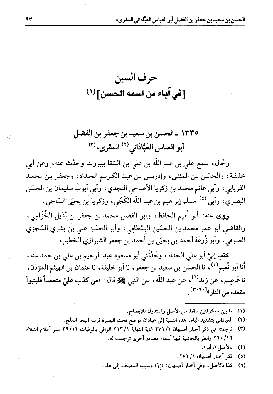" حرف السين في آباء من اسمه الحسن " (1) 1335 الحسن بن سعيد بن جعفر بن الفضل أبو العباس العباداني (2) المقرئ (3) رحال سمع علي بن عبد الله بن علي بن السقا ببيروت وحدث عنه وعن أبي خليفة والحسن بن المثنى وإدريس بن عبد الكريم الحداد وجعفر بن محمد الفريابي وأبي غانم محمد بن زكريا الأصاحي النجدي وأبي أيوب سليمان بن الحسن البصري وأبي (4) مسلم إبراهيم بن عبد الله الكجي وزكريا بن يحيى الساجي روى عنه أبو نعيم الحافظ وأبو الفضل محمد بن جعفر بن بديل الخزاعي والقاضي أبو عمر محمد بن الحسين البسطامي وأبو الحسن علي بن بشري السجزي الصوفي وأبو زرعة أحمد بن يحيى بن أحمد بن جعفر الشيرازي الخطيب كتب إلي أبو علي الحداد وحدثني أبو مسعود عبد الرحيم بن علي بن حمد عنه أنا أبو نعيم (5) نا الحسن بن سعيد بن جعفر نا أبو خليفة نا عثمان بن الهيثم المؤذن نا عاصم عن زيد (6) عن عبد الله عن النبي (صلى الله عليه وسلم) من كذب علي متعمدا فليتبوأ مقعده من النار
