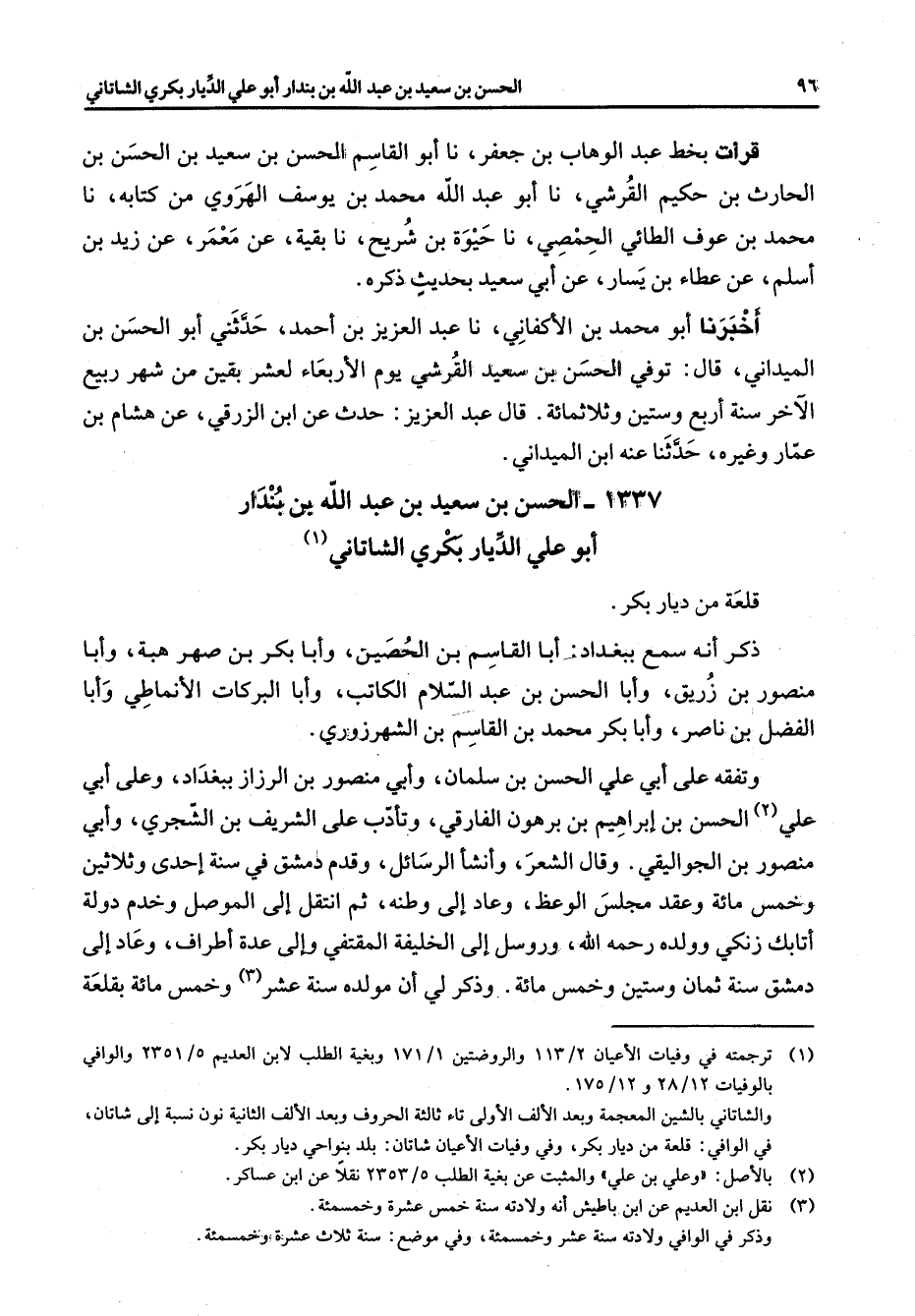 قرأت بخط عبد الوهاب بن جعفر نا أبو القاسم الحسن بن سعيد بن الحسن بن الحارث بن حكيم القرشي نا أبو عبد الله محمد بن يوسف الهروي من كتابه نا محمد بن عوف الطائي الحمصي نا حيوة بن شريح نا بقية عن معمر عن زيد بن أسلم عن عطاء بن يسار عن أبي سعيد بحديث ذكره أخبرنا أبو محمد بن الأكفاني نا عبد العزيز بن أحمد حدثني أبو الحسن بن الميداني قال توفي الحسن بن سعيد القرشي يوم الأربعاء لعشر بقين من شهر ربيع الآخر سنة أربع وستين وثلاثمائة قال عبد العزيز حدث عن ابن الزرقي عن هشام بن عمار وغيره حدثنا عنه ابن الميداني 1337 - الحسن بن سعيد بن عبد الله بن بندار أبو علي الديار بكري الشاتاني (1) قلعة من ديار بكر ذكر أنه سمع ببغداد أبا القاسم بن الحصين وأبا بكر بن صهر هبة وأبا منصور بن زريق وأبا الحسن بن عبد السلام الكاتب وأبا البركات الأنماطي وأبا الفضل بن ناصر وأبا بكر محمد بن القاسم بن الشهرزوري وتفقه على أبي علي الحسن بن سلمان وأبي منصور بن الرزاز ببغداد وعلى أبي علي (2) الحسن بن إبراهيم بن برهون الفارقي وتأدب على الشريف بن الشجري وأبي منصور بن الجواليقي وقال الشعر وأنشأ الرسائل وقدم دمشق في سنة إحدى وثلاثين وخمس مائة وعقد مجلس الوعظ وعاد إلى وطنه ثم انتقل إلى الموصل وخدم دولة أتابك زنكي وولده رحمه الله وروسل إلى الخليفة المقتفي والى عدة أطراف وعاد إلى دمشق سنة ثمان وستين وخمس مائة وذكر لي أن مولده سنة عشر (3) وخمس مائة بقلعة