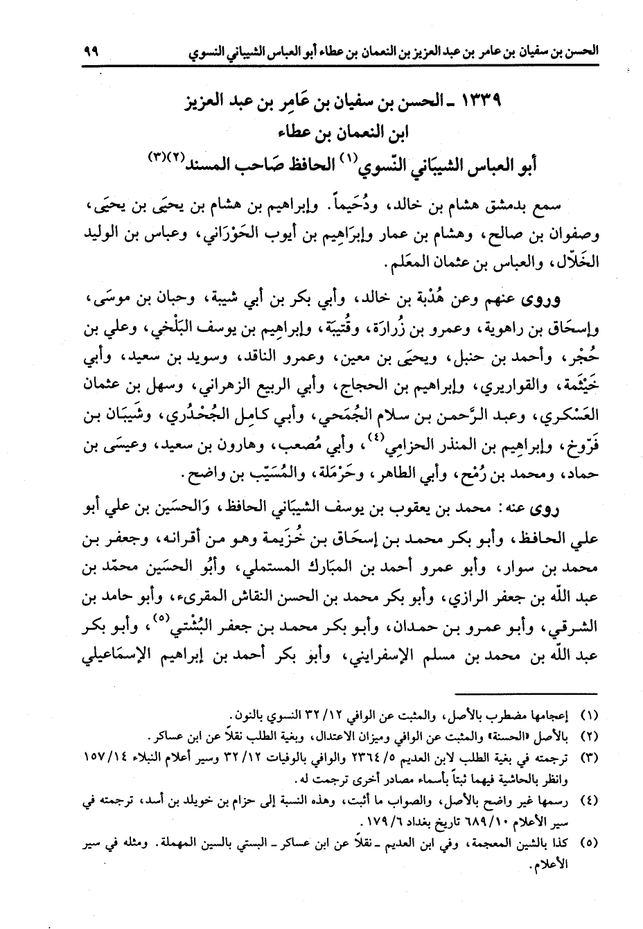 1339 - الحسن بن سفيان بن عامر بن عبد العزيز ابن النعمان بن عطاء أبو العباس الشيباني النسوي (1) الحافظ صاحب المسند (2) (3) سمع بدمشق هشام بن خالد ودحيما وإبراهيم بن هشام بن يحيى بن يحيى وصفوان بن صالح وهشام بن عمار وإبراهيم بن أيوب الحوراني وعباس بن الوليد الخلال والعباس بن عثمان المعلم وروى عنهم وعن هدبة بن خالد وأبي بكر بن أبي شيبة وحبان بن موسى وإسحاق بن راهوية وعمرو بن زرارة وقتيبة وإبراهيم بن يوسف البلخي وعلي بن حجر وأحمد بن حنبل ويحيى بن معين وعمرو الناقد وسويد بن سعيد وأبي خيثمة والقواريري وإبراهيم بن الحجاج وأبي الربيع الزهراني وسهل بن عثمان العسكري وعبد الرحمن بن سلام الجمحي وأبي كامل الجحدري وشيبان بن فروخ وإبراهيم بن المنذر الحزامي وأبي مصعب وهارون بن سعيد وعيسى بن حماد ومحمد بن رمح وأبي الطاهر وحرملة والمسيب بن واضح روى عنه محمد بن يعقوب بن يوسف الشيباني الحافظ والحسين بن علي أبو علي الحافظ وأبو بكر محمد بن إسحاق بن خزيمة وهو من أقرانه وجعفر بن محمد بن سوار وأبو عمرو أحمد بن المبارك المستملي وأبو الحسين محمد بن عبد الله بن جعفر الرازي وأبو بكر محمد بن الحسن النقاش المقرئ وأبو حامد بن الشرقي وأبو عمرو بن حمدان وأبو بكر محمد بن جعفر البشتي (5) وأبو بكر عبد الله بن محمد بن مسلم الإسفرايني وأبو بكر أحمد بن إبراهيم الإسماعيلي