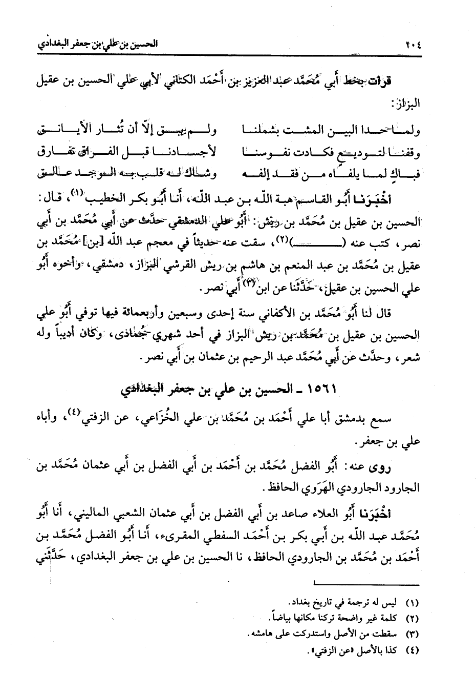 1561 - الحسين بن علي بن جعفر البغدادي سمع بدمشق أبا علي أحمد بن محمد بن علي الخزاعي عن الزفتي (4) وأباه علي بن جعفر روى عنه أبو الفضل محمد بن أحمد بن أبي الفضل بن أبي عثمان محمد بن الجارود الجارودي الهروي الحافظ أخبرنا أبو العلاء صاعد بن أبي الفضل بن أبي عثمان الشعبي الماليني أنا أبو محمد عبد الله بن أبي بكر بن أحمد السفطي المقرئ أنا أبو الفضل محمد بن أحمد بن محمد بن الجارودي الحافظ نا الحسين بن علي بن جعفر البغدادي حدثني