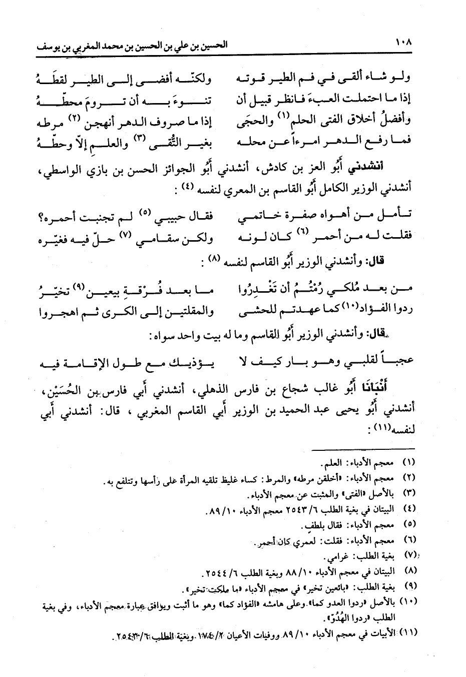 ولو شاء ألقى في فم الطير قوته * ولكنه أفضى إلى الطير لقطه إذا ما احتملت العبء فانظر قبيل أن * تنوء به أن تروم محطه وأفضل أخلاق الفتى الحلم (1) والحجى * إذا ما صروف الدهر أنهجن (2) مرطه فما رفع الدهر امرءا عن محله * بغير التقى (3) والعلم إلا وحطه أنشدني أبو العز بن كادش أنشدني أبو الجوائز الحسن بن بازي الواسطي أنشدني الوزير الكامل أبو القاسم بن المعري لنفسه (4) : تأمل من أهواه صفرة خاتمي * فقال حبيبي (5) لم تجنبت أحمره فقلت له من أحمر (6) كان لونه * ولكن سقامي (7) حل فيه فغيره قال وأنشدني الوزير أبو القاسم لنفسه (8) من بعد ملكي رمتم أن تغدروا * ما بعد فرقة بيعين (9) تخير ردوا الفؤاد (10) كما عهدتهم للحشى * والمقلتين إلى الكرى ثم اهجروا قال وأنشدني الوزير أبو القاسم ومله بيت واحد سواه عجبا لقلبي وهو بار كيف لا * يؤذيك مع طول الإقامة فيه أنبأنا أبو غالب شجاع بن فارس الذهلي أنشدني أبي فارس بن الحسين أنشدني أبو يحيى عبد الحميد بن الوزير أبي القاسم المغربي قال أنشدني أبي لنفسه (11)