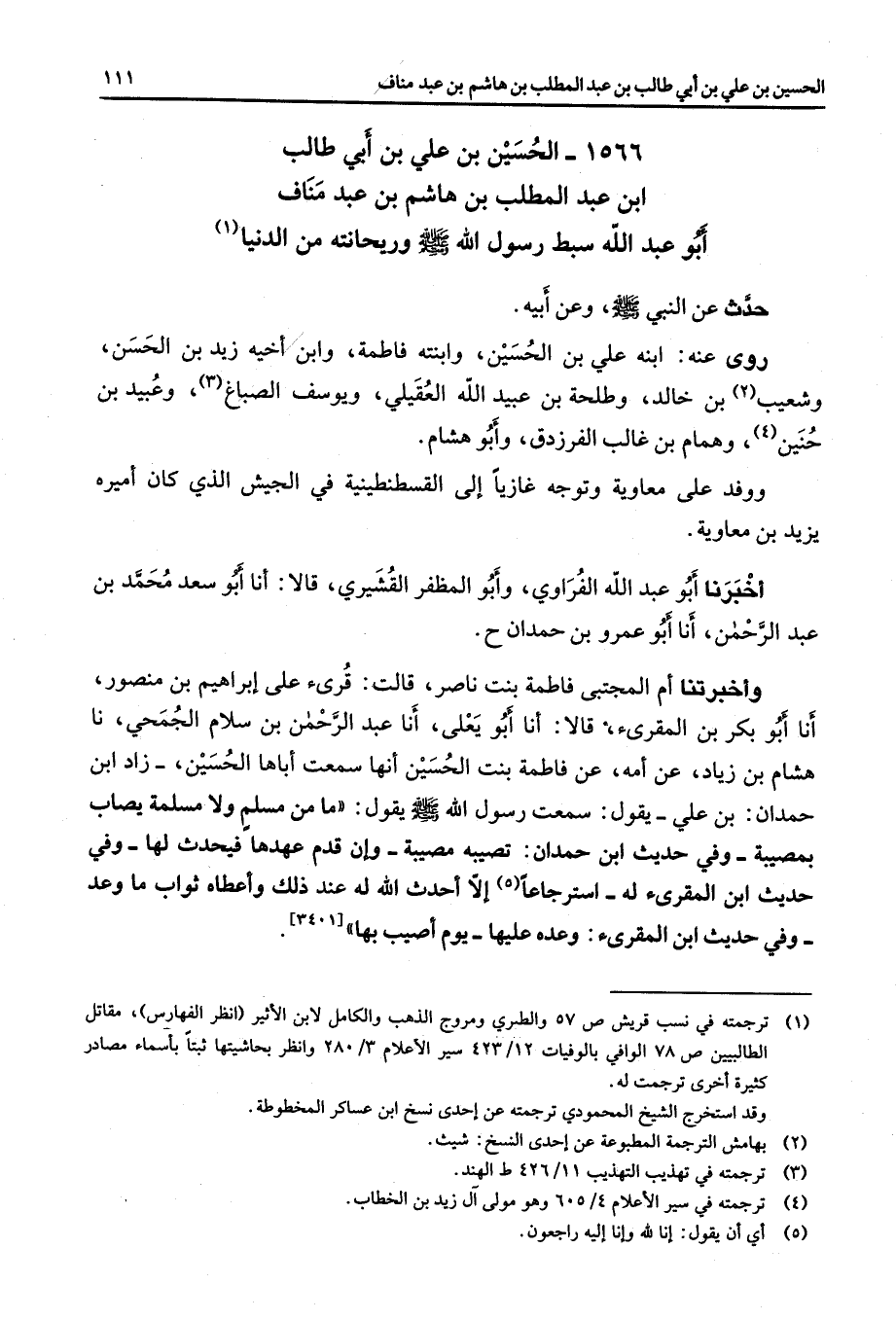 1566 - الحسين بن علي بن أبي طالب ابن عبد المطلب بن هاشم بن عبد مناف أبو عبد الله سبط رسول الله (صلى الله عليه وسلم) وريحانته من الدنيا (1) حدث عن النبي (صلى الله عليه وسلم) وعن أبيه روى عنه ابنه علي بن الحسين وابنته فاطمة وابن أخيه زيد بن الحسن وشعيب (2) بن خالد وطلحة بن عبيد الله العقيلي ويوسف الصباغ (3) وعبيد بن حنين (4) وهمام بن غالب الفرزدق وأبو هشام ووفد على معاوية وتوجه غازيا إلى القسطنطينية في الجيش الذي كان أميره يزيد بن معاوية أخبرنا أبو عبد الله الفراوي وأبو الظفر القشيري قالا أنا أبو سعد محمد بن عبد الرحمن أنا أبو عمرو بن حمدان وأخبرتنا أم المجتبى فاطمة بنت ناصر قالت قرئ على إبراهيم بن منصور أنا أبو بكر بن المقرئ قالا أنا أبو يعلى أنا عبد الرحمن بن سلام الجمحي نا هشام بن زياد عن أمه عن فاطمة بنت الحسين أنها سمعت أباها الحسين زاد ابن حمدان بن علي يقول سمعت رسول الله (صلى الله عليه وسلم) يقول ما من مسلم ولا مسلمة يصاب بمصيبة وفي حديث ابن حمدان تصيبه مصيبة وإن قدم عهدها فيحدث لها وفي حديث ابن المقرئ له استرجاعا (5) إلا أحدث الله له عند ذلك وأعطاه ثواب ما وعد وفي حديث ابن المقرئ وعده عليها يوم أصيب بها