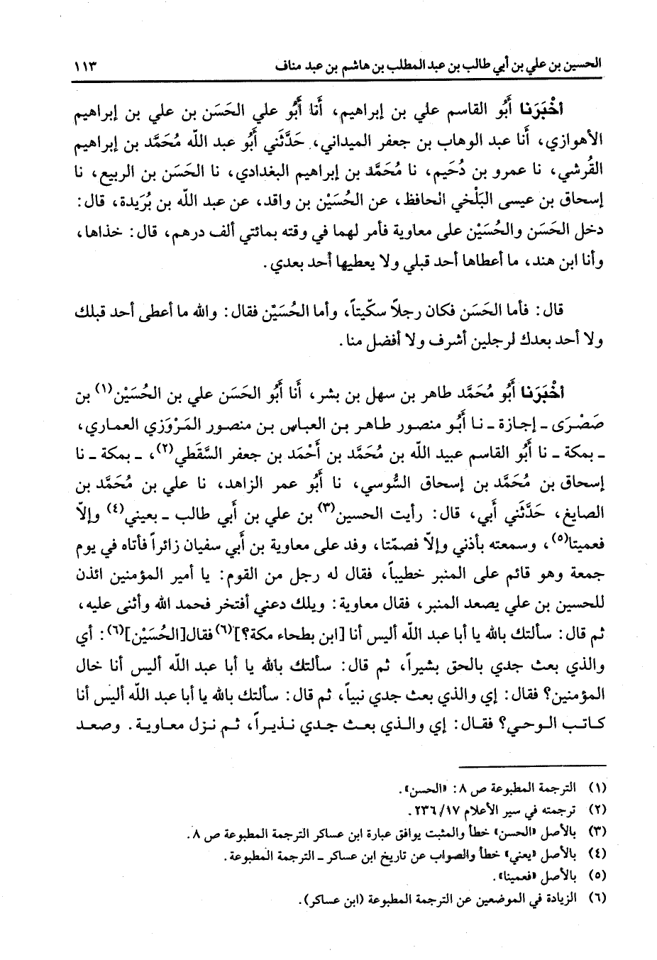 أخبرنا أبو القاسم علي بن إبراهيم أنا أبو علي الحسن بن علي بن إبراهيم الأهوازي أنا عبد الوهاب بن جعفر الميداني حدثني أبو عبد الله محمد بن إبراهيم القرشي نا عمرو بن دحيم نا محمد بن إبراهيم البغدادي نا الحسن بن الربيع نا إسحاق بن عيسى البلخي الحافظ عن الحسين بن واقد عن عبد الله بن بريدة قال دخل الحسن والحسين على معاوية فأمر لهما في وقته بمائتي ألف درهم قال خذاها وأنا ابن هند ما أعطاها أحد قبلي ولا يعطيها أحد بعدي قال فأما الحسن فكان رجلا سكيتا وأما الحسين فقال والله ما أعطى أحد قبلك ولا أحد بعدك لرجلين أشرف ولا أفضل منا أخبرنا أبو محمد طاهر بن سهل بن بشر أنا أبو الحسن علي بن الحسين (1) بن صصرى إجازة نا أبو منصور طاهر بن العباس بن منصور المروزي العماري بمكة نا أبو القاسم عبيد الله بن محمد بن أحمد بن جعفر السقطي (2) بمكة نا إسحاق بن محمد بن إسحاق السوسي نا أبو عمر الزاهد نا علي بن محمد بن الصايغ حدثني أبي قال رأيت الحسين (3) بن علي بن أبي طالب بعيني (4) وإلا فعميتا (5) وسمعته بأذني وإلا فصمتا وفد على معاوية بن أبي سفيان زائرا فأتاه في يوم جمعة وهو قائم على المنبر خطيبا فقال له رجل من القوم يا أمير المؤمنين ائذن للحسين بن علي يصعد المنبر فقال معاوية ويلك دعني أفتخر فحمد الله وأثنى عليه ثم قال سألتك بالله يا أبا عبد الله أليس أنا ابن بطحاء مكة (6) فقال الحسين (6) أي والذي بعث جدي بالحق بشيرا ثم قال سألتك بالله يا أبا عبد الله أليس أنا خال المؤمنين فقال أي والذي بعث جدي نبيا ثم قال سألتك بالله يا أبا عبد الله أليس أنا كاتب الوحي فقال إي والذي بعث جدي نذيرا ثم نزل معاوية وصعد