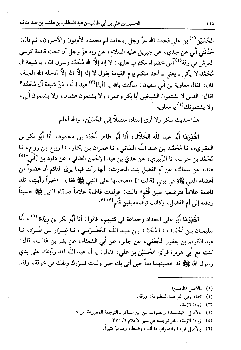 الحسين (1) بن علي فحمد الله عز وجل بمحامد لم يحمده الأولون والآخرون ثم قال حدثني أبي عن جدي عن جبريل عليه السلام عن ربه عز وجل أن تحت قائمة كرسي العرش في رقة (2) آس خضراء مكتوب عليها لا إله إلا الله محمد رسول الله يا شيعة آل محمد لا يأتي يعني أحد منكم يوم القيامة يقول لا إله إلا الله إلا أدخله الله الجنة قال فقال معاوية بن أبي سفيان سألتك بالله يا أبا (3) عبد الله من شيعة آل محمد فقال الذين لا يشتمون الشيخين أبا بكر وعمر ولا يشتمون عثمان ولا يشتمون أبي ولا يشتمونك (4) يا معاوية هذا حديث منكر ولا أرى إسناده متصلا إلى الحسين والله أعلم أخبرنا أبو عبد الله الخلال أنا أبو طاهر أحمد بن محمود أنا أبو بكر بن المقرئ نا محمد بن عبد الله الطائي نا عمران بن بكار نا ربيع بن روح نا محمد بن حرب نا الزبيري عن عدي بن عبد الرحمن الطائي عن داود بن أبي (5) هند عن سماك عن أم الفضل بنت الحارث أنها رأت فيما يرى النائم أن عضوا من أعضاء النبي (صلى الله عليه وسلم) في بيتي قالت فقصصتها على النبي (صلى الله عليه وسلم) فقال خير ارأيت تلد فاطمة غلاما فترضعيه بلبن قثم قالت فولدت فاطمة غلاما فسماه النبي (صلى الله عليه وسلم) حسينا ودفعه إلى أم الفضل وكانت ترضعه بلبن قثم أخبرنا أبو علي الحداد وجماعة في كتبهم قالوا أنا أبو بكر بن ريذة (6) أنا سليمان بن أحمد نا محمد بن عبد الله الحضرمي نا ضرار بن صرد نا عبد الكريم بن يعفور الجعفي عن جابر عن أبي الشعثاء عن بشر بن غالب قال كنت مع أبي هريرة فرأى الحسين بن علي فقال يا أبا عبد الله لقد رأيتك على يدي رسول الله (صلى الله عليه وسلم) قد خضبتها دما حين أتى بك حين ولدت فسررك ولفك في خرقة ولقد