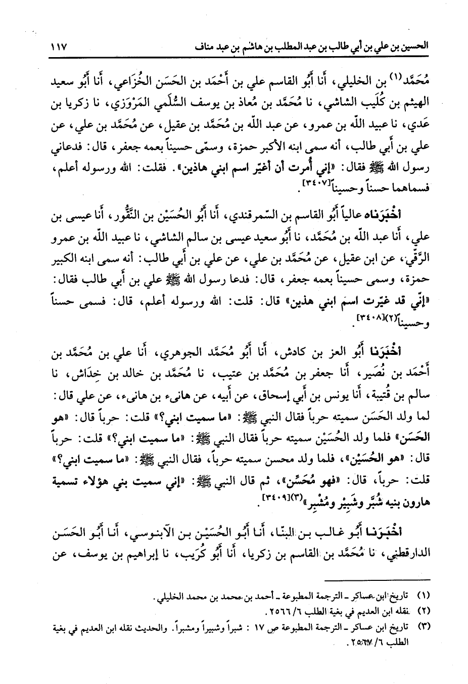 محمد (1) بن الخليلي أنا أبو القاسم علي بن أحمد بن الحسن الخزاعي أنا أبو سعيد الهيثم بن كليب الشاشي نا محمد بن معاذ بن يوسف السلمي المروزي نا زكريا بن عدي نا عبيد الله بن عمرو عن عبد الله بن محمد بن عقيل عن محمد بن علي عن علي بن أبي طالب أنه سمى ابنه الأكبر حمزة وسمى حسينا بعمه جعفر قال فدعاني رسول الله (صلى الله عليه وسلم) فقال إني أمرت أن أغير اسم ابني هاذين فقلت الله ورسوله أعلم فسماهما حسنا وحسينا أخبرناه عاليا أبو القاسم بن السمرقندي أنا أبو الحسين بن النقور أنا عيسى بن علي أنا عبد الله بن محمد نا أبو سعيد عيسى بن سالم الشاشي نا عبيد الله بن عمرو الرقي عن ابن عقيل عن محمد بن علي عن علي بن أبي طالب أنه سمى ابنه الكبير حمزة وسمى حسينا بعمه جعفر قال فدعا رسول الله (صلى الله عليه وسلم) علي بن أبي طالب فقال إني قد غيرت اسم ابني هذين قال قلت الله ورسوله أعلم قال فسمى حسنا وحسينا (2) أخبرنا أبو العز بن كادش أنا أبو محمد الجوهري أنا علي بن محمد بن أحمد بن نصير أنا جعفر بن محمد بن عتيب نا محمد بن خالد بن خداش نا سالم بن قتيبة أنا يونس بن أبي إسحاق عن أبيه عن هانئ بن هانئ عن علي قال لما ولد الحسن سميته حربا فقال النبي (صلى الله عليه وسلم) ما سميت ابني قلت حربا قال هو الحسن فلما ولد الحسين سميته حربا فقال النبي (صلى الله عليه وسلم) ما سميت ابني قلت حربا قال هو الحسين فلما ولد محسن سميته حربا فقال النبي (صلى الله عليه وسلم) ما سميت ابني قلت حربا قال فهو محسن ثم قال النبي (صلى الله عليه وسلم) إنيسميت بني هؤلاء تسمية هارون بنيه شبر وشبير ومشبر) (3) [* * *] أخبرنا أبو غالب بن البنا أنا أبو الحسين بن الآبنوسي أنا أبو الحسن الدارقطني نا محمد بن القاسم بن زكريا أنا أبو كريب نا إبراهيم بن يوسف عن