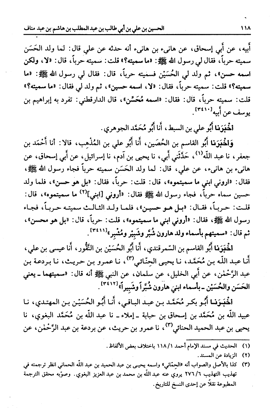 أبيه عن أبي إسحاق عن هانئ بن هانئ أنه حدث عن علي قال لما ولد الحسن سميته حربا فقال لي رسول الله (صلى الله عليه وسلم) ما سميته قلت سميته حربا قال لا ولكن اسمه حسن ثم ولد لي الحسين فسميته حربا قال فقال لي رسول الله (صلى الله عليه وسلم) ما سميته قلت سميته حربا فقال لا اسمه حسين ثم ولد لي فقال ما سميته؟) قلت سميته حربا قال فقال اسمه محسن قال الدارقطني تفرد به إبراهيم بن يوسف عن أبيه أخبرنا أبو علي بن السبط أنا أبو محمد الجوهري وأخبرنا أبو القاسم بن الحصين أنا أبو علي بن المذهب قالا أنا أحمد بن جعفر نا عبد الله (1) حدثني أبي نا يحيى بن آدم نا إسرائيل عن أبي إسحاق عن هانئ بن هانئ عن علي قال لما ولد الحسن سميته حربا فجاء رسول الله (صلى الله عليه وسلم) فقال أروني ابني ما سميتموه قال قلت حربا فقال بل هو حسن فلما ولد حسين سماه حربا فجاء رسول الله (صلى الله عليه وسلم) فقال أروني ابني (2) ما سميتموه قال قلت حربا فقال بل هو حسين فلما ولد الثالث سميته حربا فجاء رسول الله (صلى الله عليه وسلم) فقال أروني ابني ما سميتموه قلت حربا قال بل هو محسن ثم قال سميتهم بأسماء ولد هارون شبر وشبير ومشبر أخبرنا أبو القاسم بن السمرقندي أنا أبو الحسين بن النقور أنا عيسى بن علي أنا عبد الله بن محمد نا يحيى الحنائي (3) نا عمرو بن حريث نا بردعة بن عبد الرحمن عن أبي الخليل عن سلمان عن النبي (صلى الله عليه وسلم) أنه قال سميتهما يعني الحسن والحسين بأسماء ابني هارون شبرا وشبيرا أخبرنا أبو بكر محمد بن عبد الباقي أنا أبو الحسين بن المهتدي نا عبيد الله بن محمد بن إسحاق بن حبابة إملاء نا عبد الله بن محمد البغوي نا يحيى بن عبد الحميد الحنائي (3) نا عمرو بن حريث عن بردعة بن عبد الرحمن عن