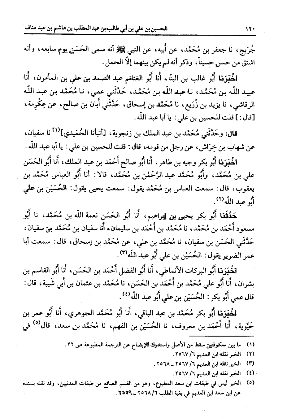 جريج نا جعفر بن محمد عن أبيه عن النبي (صلى الله عليه وسلم) أنه سمى الحسن يوم سابعه وأنه اشتق من حسن حسينا وذكر أنه لم يكن بينهما إلا الحمل أخبرنا أبو غالب بن البنا أنا أبو الغنائم عبد الصمد بن علي بن المأمون أنا عبيد الله بن محمد نا عبد الله بن محمد حدثني عمي نا محمد بن عبد الله الرقاشي نا يزيد بن زريع نا محمد بن إسحاق حدثني أبان بن صالح عن عكرمة قال قلت للحسين بن علي يا أبا عبد الله قال وحدثني محمد بن عبد الملك بن زنجوية أنبأنا الحميدي (1) نا سفيان عن شهاب بن خراش عن رجل من قومه قال قلت للحسين بن علي يا أبا عبد الله أخبرنا أبو بكر وجيه بن طاهر أنا أبو صالح أحمد بن عبد الملك أنا أبو الحسن علي بن محمد وأبو محمد عبد الرحمن بن محمد قالا أنا أبو العباس محمد بن يعقوب قال سمعت العباس بن محمد يقول سمعت يحيى يقول الحسين بن علي أبو عبد الله (2) حدثنا أبو بكر يحيى بن إبراهيم أنا أبو الحسن نعمة الله بن محمد نا أبو مسعود أحمد بن محمد نا محمد بن أحمد بن سليمان أنا سفيان بن محمد بن سفيان حدثني الحسن بن سفيان نا محمد بن علي عن محمد بن إسحاق قال سمعت أبا عمر الضرير يقول الحسين بن علي أبو عبد الله (3) أخبرنا أبو البركات الأنماطي أنا أبو الفضل أحمد بن الحسن أنا أبو القاسم بن بشران أنا أبو علي محمد بن أحمد بن الحسن نا محمد بن عثمان بن أبي شيبة قال قال عمي أبو بكر الحسين بن علي أبو عبد الله (4) أخبرنا أبو بكر محمد بن عبد الباقي أنا أبو محمد الجوهري أنا أبو عمر بن حيوية أنا أحمد بن معروف نا الحسين بن الفهم نا محمد بن سعد قال (5) في