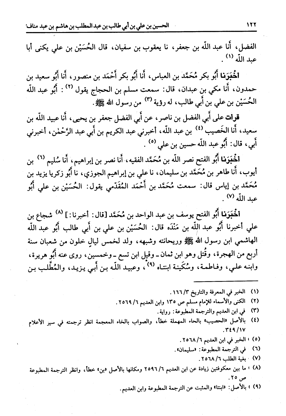 الفضل أنا عبد الله بن جعفر نا يعقوب بن سفيان قال الحسين بن علي يكنى أبا عبد الله (1) أخبرنا أبو بكر محمد بن العباس أنا أبو بكر أحمد بن منصور أنا أبو سعيد بن حمدون أنا مكي بن عبدان قال سمعت مسلم بن الحجاج يقول (2) أبو عبد الله الحسين بن علي بن أبي طالب له رؤية (3) من رسول (صلى الله عليه وسلم) قرأت على أبي الفضل بن ناصر عن أبي الفضل جعفر بن يحيى أنا عبيد الله بن سعيد أنا الخصيب (4) بن عبد الله أخبرني عبد الكريم بن أبي عبد الرحمن أخبرني أبي قال أبو عبد الله حسين بن علي (5) أخبرنا أبو الفتح نصر الله بن محمد الفقيه أنا نصر بن إبراهيم أنا سليم (6) بن أيوب أنا طاهر بن محمد بن سليمان نا علي بن إبراهيم الجوزي نا أبو زكريا يزيد بن محمد بن إياس قال سمعت محمد بن أحمد المقدمي يقول الحسين بن علي أبو عبد الله (7) أخبرنا أبو الفتح يوسف بن عبد الواحد بن محمد قال أخبرنا (8) شجاع بن علي أخبرنا أبو عبد الله بن مندة قال الحسين بن علي بن أبي طالب أبو عبد الله الهاشمي ابن رسول الله (صلى الله عليه وسلم) وريحانته وشبهه ولد لخمس ليال خلون من شعبان سنة أربع من الهجرة وقتل وهو ابن ثمان وقيل ابن تسع وخمسين روى عنه أبو هريرة وابنه علي وفاطمة وسكينة ابنتاه (9) وعبيد الله بن أبي يزيد والمطلب بن