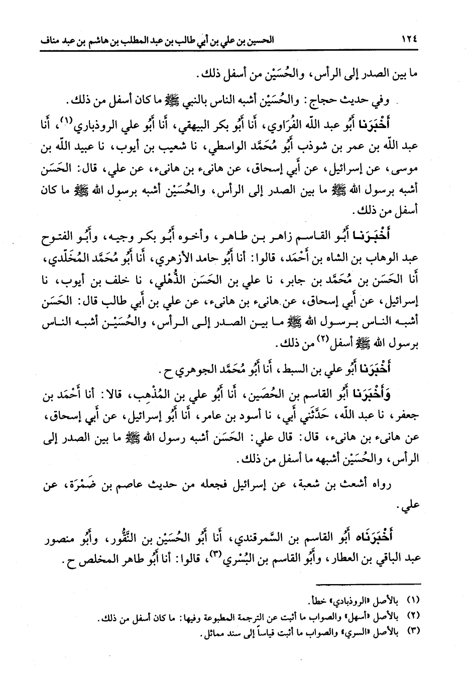 ما بين الصدر إلى الرأس والحسين من أسفل ذلك وفي حديث حجاج والحسين أشبه الناس بالنبي (صلى الله عليه وسلم) ما كان أسفل من ذلك أخبرنا أبو عبد الله الفراوي أنا أبو بكر البيهقي أنا أبو علي الروذباري (1) أنا عبد الله بن عمر بن شوذب أبو محمد الواسطي نا شعيب بن أيوب نا عبيد الله بن موسى عن إسرائيل عن أبي إسحاق عن هانئ بن هانئ عن علي قال الحسن أشبه برسول الله (صلى الله عليه وسلم) ما بين الصدر إلى الرأس والحسين أشبه برسول الله (صلى الله عليه وسلم) وما كان أسفل من ذلك أخبرنا أبو القاسم زاهر بن طاهر وأخوه أبو بكر وجيه وأبو الفتوح عبد الوهاب بن الشاه بن أحمد قالوا أنا أبو حامد الأزهري أنا أبو محمد المخلدي أنا الحسن بن محمد بن جابر نا علي بن الحسن الذهلي نا خلف بن أيوب نا إسرائيل عن أبي إسحاق عن هانئ بن هانئ عن علي بن أبي طالب قال الحسن أشبه برسول الله (صلى الله عليه وسلم) ما بين الصدر إلى الرأس والحسين أشبه الناس برسول الله (صلى الله عليه وسلم) اسفل (2) من ذلك اخبرنا أبو علي بن البسط أنا أبو محمد الجوهري ح وأخبرنا أبو القاسم بن الحصين أنا أبو علي بن المذهب قالا أنا أحمد بن جعفر نا عبد الله حدثني أبي نا أسود بن عامر أنا أبو إسرائيل عن أبي إسحاق عن هانئ بن هانئ قال قال علي الحسن أشبه رسول الله (صلى الله عليه وسلم) ما بين الصدر إلى الرأس والحسين أشبهه ما أسفل من ذلك رواه أشعث بن شعبة عن إسرائيل فجعله من حديث عاصم بن ضمرة عن علي أخبرناه أبو القاسم بن السمرقندي أنا أبو الحسين بن النقور وأبو منصور عبد الباقي بن العطار وأبو القاسم بن البسري (3) قالوا أنا أبو طاهر المخلص ح