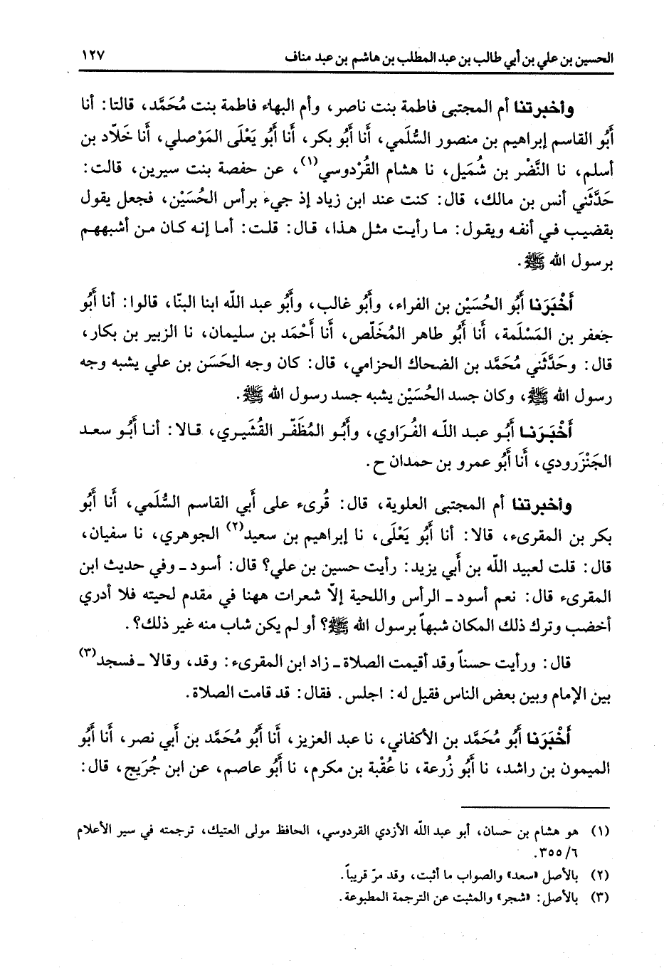وأخبرتنا أم المجتبى فاطمة بنت ناصر وأم البهاء فاطمة بنت محمد قالتا أنا أبو القاسم إبراهيم بن منصور السلمي أنا أبو بكر أنا أبو يعلى الموصلي أنا خلاد بن أسلم نا النضر بن شميل نا هشام القردوسي (1) عن حفصة بنت سيرين قالت حدثني أنس بن مالك قال كنت عند ابن زياد إذ جئ برأس الحسين فجعل يقول بقضيب في أنفه ويقول ما رأيت مثل هذا قال قلت أما إنه كان من أشبههم برسول الله (صلى الله عليه وسلم) أخبرنا أبو الحسين بن الفراء وأبو غالب وأبو عبد الله ابنا البنا قالوا أنا أبو جعفر بن المسلمة أنا أبو طاهر المخلص أنا أحمد بن سليمان نا الزبير بن بكار قال وحدثني محمد بن الضحاك الحزامي قال كان وجه الحسن بن علي يشبه وجه رسول الله (صلى الله عليه وسلم) وكان جسد الحسين يشبه جسد رسول الله (صلى الله عليه وسلم) أخبرنا أبو عبد الله الفراوي وأبو المظفر القشيري قالا أنا أبو سعد الجنزرودي أنا أبو عمرو بن حمدان وأخبرتنا أم المجتبى العلوية قال قرئ على أبي القاسم السلمي أنا أبو بكر بن المقرئ قالا أنا أبو يعلى نا إبراهيم بن سعيد (2) الجوهري نا سفيان قال قلت لعبيد الله بن أبي يزيد رأيت حسين بن علي قال أسود وفي حديث ابن المقرئ قال نعم أسود الرأس واللحية إلا شعرات ههنا في مقدم لحيته فلا أدري أخضب وترك ذلك المكان شبها برسول الله (صلى الله عليه وسلم) أو لم يكن شاب منه غير ذلك قال ورأيت حسنا وقد أقيمت الصلاة زاد ابن المقرئ وقد وقالا فسجد (3) بين الإمام وبين بعض الناس فقيل له اجلس فقال قد قامت الصلاة أخبرنا أبو محمد بن الأكفاني نا عبد العزيز أنا أبو محمد بن أبي نصر أنا أبو الميمون بن راشد نا أبو زرعة نا عقبة بن مكرم نا أبو عاصم عن ابن جريج قال