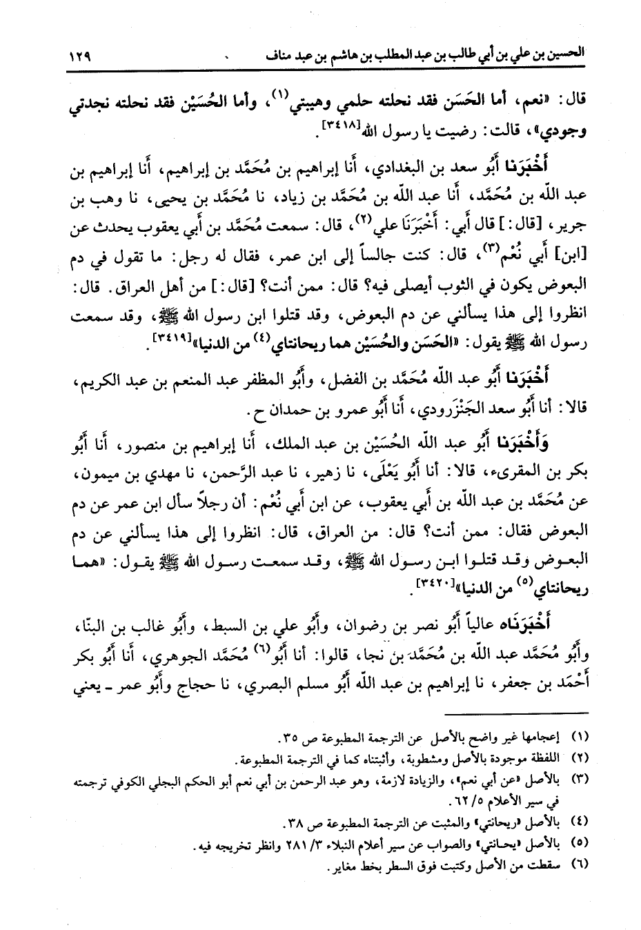 قال نعم أما الحسن فقد نحلته حلمي وهيبتي (1) وأما الحسين فقد نحلته نجدتي وجودي قالت رضيت يا رسول الله أخبرنا أبو سعد بن البغدادي أنا إبراهيم بن محمد بن إبراهيم أنا إبراهيم بن عبد الله بن محمد أنا عبد الله بن محمد بن زياد نا محمد بن يحيى نا وهب بن جرير قال قال أبي أخبرنا علي (2) قال سمعت محمد بن أبي يعقوب يحدث عن ابن أبي نعم (3) قال كنت جالسا إلى ابن عمر فقال له رجل ما تقول في دم البعوض يكون في الثوب أيصلى فيه قال ممن أنت قال من أهل العراق قال انظروا إلى هذا يسألني عن دم البعوض وقد قتلوا ابن رسول الله (صلى الله عليه وسلم) وقد سمعت رسول الله يقول الحسن والحسين هما ريحانتاي (4) من الدنيا أخبرنا أبو عبد الله محمد بن الفضل وأبو المظفر عبد المنعم بن عبد الكريم قالا أنا أبو سعد الجنزرودي أنا أبو عمرو بن حمدان وأخبرنا أبو عبد الله الحسين بن عبد الملك أنا إبراهيم بن منصور أنا أبو بكر بن المقرئ قالا أنا أبو يعلى نا زهير نا عبد الرحمن نامهدي بن ميمون عن محمد بن عبد الله بن أبي يعقوب عن ابن أبي نعم أن رجلا سأل ابن عمر عن دم البعوض فقال ممن أنت قال من العراق قال انظروا إلى هذا يسألني عن دم البعوض وقد قتلوا ابن رسول الله (صلى الله عليه وسلم) وقد سمعت رسول الله (صلى الله عليه وسلم) يقول هما ريحانتاي (5) من الدنيا أخبرناه عاليا أبو نصر بن رضوان وأبو علي بن السبط وأبو غالب بن البنا وأبو محمد عبد الله بن محمد بن نجا قالوا أنا أبو (6) محمد الجوهري أنا أبو بكر أحمد بن جعفر نا إبراهيم بن عبد الله أبو مسلم البصري نا حجاج وأبو عمر يعني