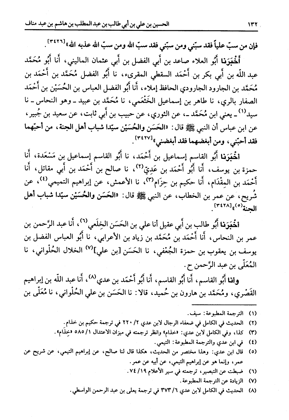 فإن من سب عليا فقد سبني ومن سبني فقد سب الله ومن سب الله عذبه الله أخبرنا أبو العلاء صاعد بن أبي الفضل بن أبي عثمان الماليني أنا أبو محمد عبد الله بن أبي بكر بن أحمد السقطي المقرئ نا أبو الفضل محمد بن أحمد بن محمد بن الجارود الجارودي الحافظ إملاء أنا أبو الفضل العباس بن الحسين بن أحمد الصفار بالري نا طاهر بن إسماعيل الخثعمي نا محمد بن عبيد وهو النحاس نا سيد (1) يعني ابن محمد عن الثوري عن حبيب بن أبي ثابت عن سعيد بن جبير عن ابن عباس أن النبي (صلى الله عليه وسلم) قال الحسن والحسين سيد شباب أهل الجنة من أحبهما فقد أحبني ومن أبغضهما فقد أبغضني أخبرنا أبو القاسم إسماعيل بن أحمد نا أبو القاسم إسماعيل بن مسعدة أنا حمزة بن يوسف أنا أبو أحمد بن عدي (2) نا صالح بن أحمد بن أبي مقاتل أنا أحمد بن المقدام أنا حكيم بن حزام (3) نا الأعمش عن إبراهيم التميمي (4) عن شريح عن عمر بن الخطاب عن النبي (صلى الله عليه وسلم) قال الحسن والحسين سيدا شباب أهل الجنة (5) أخبرنا أبو طالب بن أبي عقيل أنا علي بن الحسن الخلعي (6) أنا عبد الرحمن بن عمر بن النحاس أنا أحمد بن محمد بن زياد بن الأعرابي نا أبو العباس الفضل بن يوسف بن يعقوب بن حمزة الجعفي نا الحسن بن علي (7) الخلال الحلواني نا المعلى بن عبد الرحمن وأنا أبو القاسم أنا أبو القاسم أنا أبو أحمد بن عدي (8) أنا عبد الله بن إبراهيم القصري ومحمد بن هارون بن حميد قالا نا الحسن بن علي الحلواني نا معلى بن