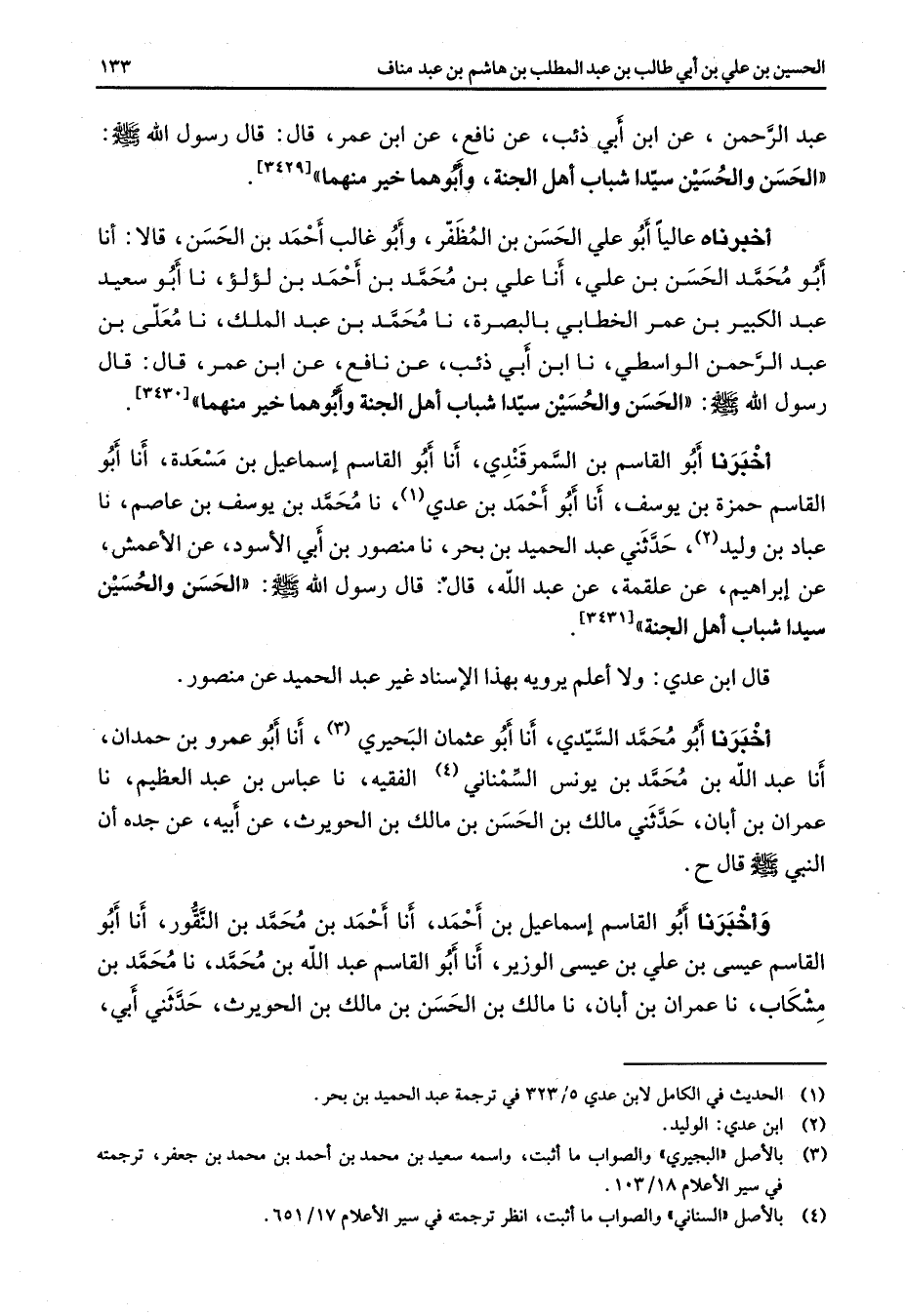 عبد الرحمن عن ابن أبي ذئب عن نافع عن ابن عمر قال قال رسول الله (صلى الله عليه وسلم) الحسن والحسين سيدا شباب أهل الجنة وأبو هما خير منهما أخبرناه عاليا أبو علي الحسن بن المظفر وأبو غالب أحمد بن الحسن قالا أنا أبو محمد الحسن بن علي أنا علي بن محمد بن أحمد بن لؤلؤ نا أبو سعيد عبد الكبير بن عمر الخطابي بالبصرة نا محمد بن عبد الملك نا معلى بن عبد الرحمن الواسطي نا ابن أبي ذئب عن نافع عن ابن عمر قال قال رسول الله (صلى الله عليه وسلم) الحسن والحسين سيدا شباب أهل الجنة وأبوهما خير منهما أخبرنا أبو القاسم بن السمرقندي أنا أبو القاسم إسماعيل بن مسعدة أنا أبو القاسم حمزة بن يوسف أنا أبو أحمد بن عدي (1) نا محمد بن يوسف بن عاصم نا عباد بن وليد (2) حدثني عبد الحميد بن بحر نا منصور بن أبي الأسود عن الأعمش عن إبراهيم عن علقمة عن عبد الله قال قال رسول الله (صلى الله عليه وسلم) الحسن والحسين سيدا شباب أهل الجنة قال ابن عدي ولا أعلم يرويه بهذا الإسناد غير عبد الحميد عن منصور أخبرنا أبو محمد السيدي أنا أبو عثمان البحيري (3) أنا أبو عمرو بن حمدان أنا عبد الله بن محمد بن يونس السمناني (4) الفقيه نا عباس بن عبد العظيم نا عمران بن أبان حدثني مالك بن الحسن بن مالك بن الحويرث عن أبيه عن جده أن النبي (صلى الله عليه وسلم) قال وأخبرنا أبو القاسم إسماعيل بن أحمد أنا أحمد بن محمد بن النقور أنا أبو القاسم عيسى بن علي بن عيسى الوزير أنا أبو القاسم عبد الله بن محمد نا محمد بن مشكاب نا عمران بن ابان نا مالك بن الحسن بن مالك بن الحويرث حدثني أبي