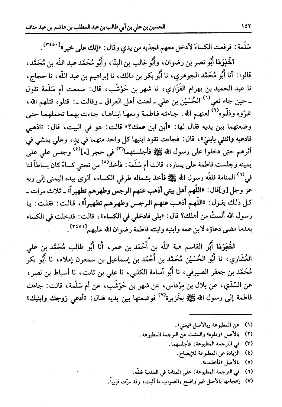 [5] (4) وجلس علي على يمينه وجلست فاطمة على يساره قالت أم سلمة فأخذ (5) من تحتي كساء كان بساطا لنا في (6) المنامة فلفه رسول الله (صلى الله عليه وسلم) فأخذ شماله طرفي الكساء ألوى بيده اليمنى إلى ربه عز وجل وقال اللهم أهل بيتي أذهب عنهم الرجس وطهرهم تطهيرا ثلاث مرات كل ذلك يقول اللهم أذهب عنهم الرجس وطهرهم تطهيرا قالت فقلت يا رسول الله ألست من أهلك قال بلى فادخلي في الكساء قالت فدخلت في الكساء بعدما مضى دعاؤه لابن عمه وابنيه وابنته فاطمة رضوان الله عليهم أخبرنا أبو القاسم هبة الله بن أحمد بن عمر أنا أبو طالب محمد بن علي العشاري نا أبو الحسين محمد بن أحمد بن إسماعيل بن سمعون إملاء نا أبو بكر محمد بن جعفر الصيرفي نا أبو أسامة الكلبي نا علي بن ثابت نا أسباط بن نصر عن السدي عن بلال بن مرداس عن شهر بن حوشب عن أم سلمة قالت جاءت فاطمة إلى رسول الله (صلى الله عليه وسلم) بخزيرة (7) فوضعتها بين يديه فقال أدعي زوجك وابنيك
