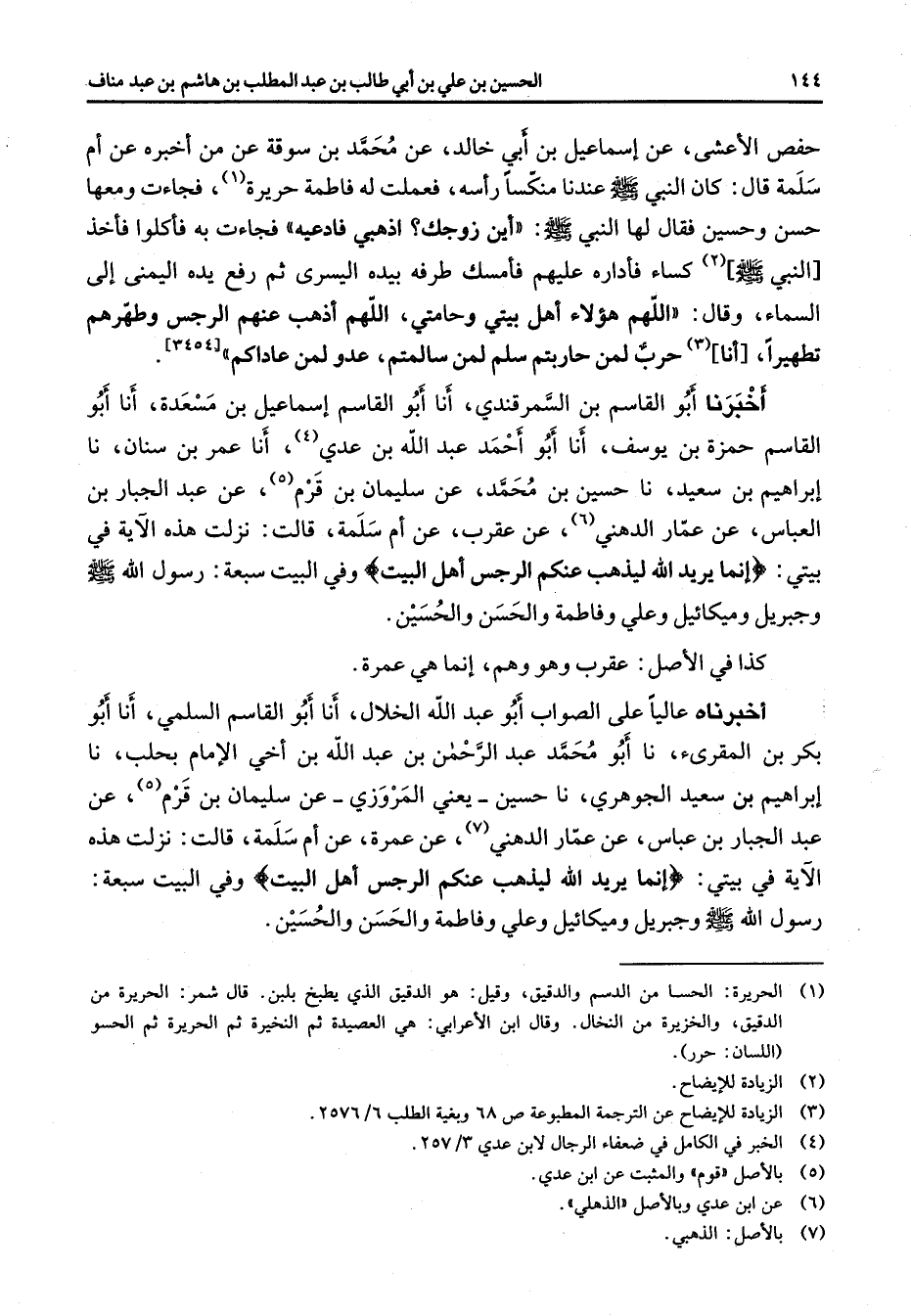 حفص الأعشى عن إسماعيل بن أبي خالد عن محمد بن سوقة عن من أخبره عن أم سلمة قال كان النبي (صلى الله عليه وسلم) عندنا منكسا رأسه فعملت له فاطمة حريرة (1) فجاءت ومعها حسن وحسين فقال لها النبي (صلى الله عليه وسلم) أين زوجك اذهبي فادعيه فجاءت به فأكلوا فأخذ النبي (صلى الله عليه وسلم) (2) كساء فأداره عليهم فأمسك طرفه بيده اليسرى ثم رفع يده اليمنى إلى السماء وقال اللهم هؤلاء أهل بيتي وحامتي اللهم أذهب عنهم الرجس وطهرهم تطهيرا أنا (3) حرب لمن حاربتم سلم لمن سالمتم عدو لمن عاداكم أخبرنا أبو القاسم بن السمرقندي أنا أبو القاسم إسماعيل بن مسعدة أنا أبو القاسم حمزة بن يوسف أنا أبو أحمد عبد الله بن عدي (4) أنا عمر بن سنان نا إبراهيم بن سعيد نا حسين بن محمد عن سليمان بن قرم (5) عن عبد الجبار بن العباس عن عمار الدهني (6) عن عقرب عن أم سلمة قالت نزلت هذه الآية في بيتي " إنما يريد الله ليذهب عنكم الرجس أهل البيت " وفي البيت سبعة رسول الله (صلى الله عليه وسلم) وجبريل وميكائيل وعلي وفاطمة والحسن والحسين كذا في الأصل عقرب وهو وهم إنما هي عمرة أخبرناه عاليا على الصواب أبو عبد الله الخلال أنا أبو القاسم السلمي أنا أبو بكر بن المقرئ نا أبو محمد عبد الرحمن بن عبد الله بن أخي الإمام بحلب نا إبراهيم بن سعيد الجوهري نا حسين يعني المروزي عن سليمان بن قرم (5) عن عبد الجبار بن عباس عن عمار الدهني (7) عن عمرة عن أم سلمة قالت نزلت هذه الآية في بيتي " إنما يريد الله ليذهب عنكم الرجس أهل البيت " وفي البيت سبعة رسول الله (صلى الله عليه وسلم) وجبريل وميكائيل وعلي وفاطمة والحسن والحسين