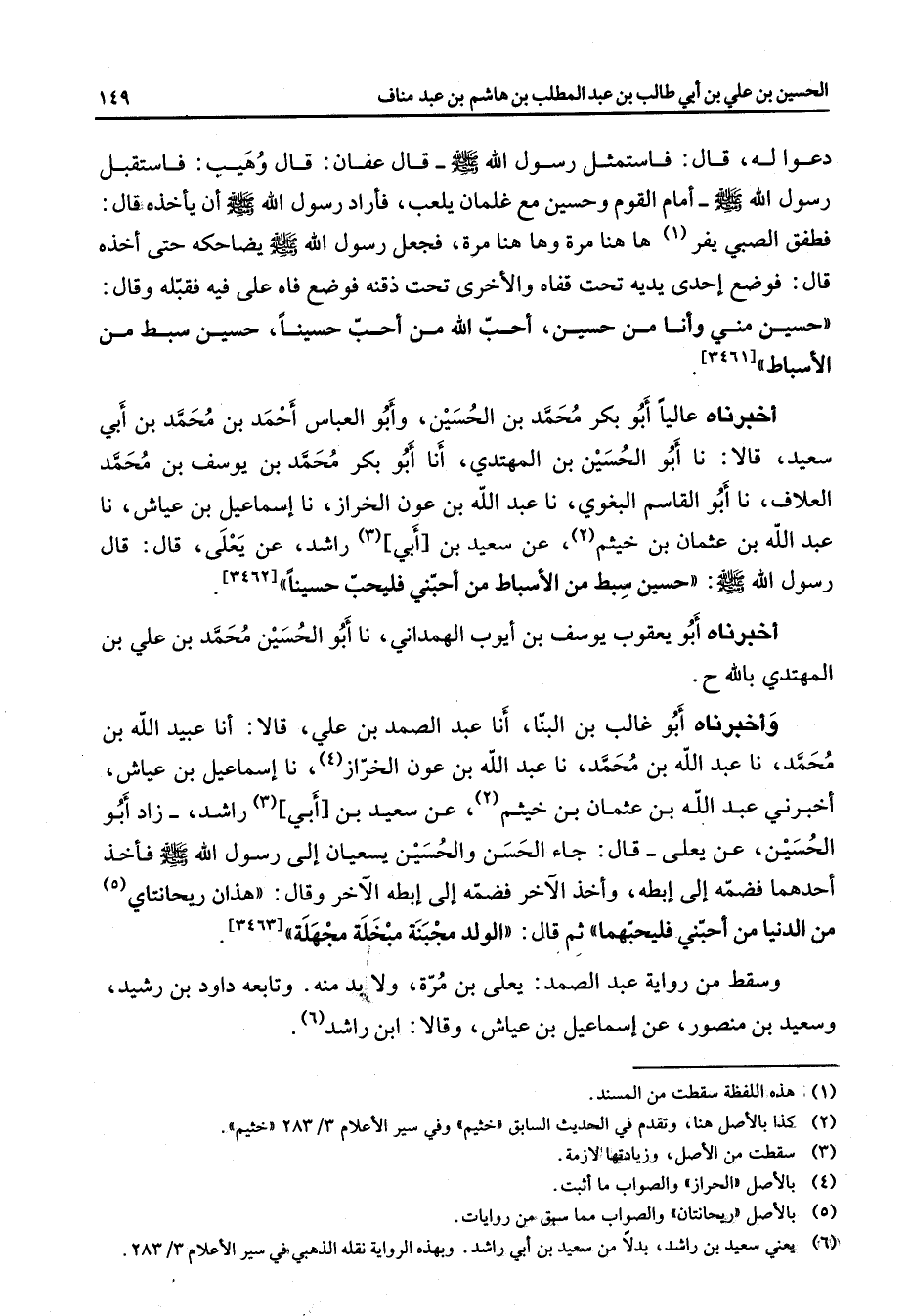 دعوا له قال فاستمثل رسول الله (صلى الله عليه وسلم) قال عفان قال وهيب فاستقبل رسول الله (صلى الله عليه وسلم) أمام القوم وحسين مع غلمان يلعب فأراد رسول الله (صلى الله عليه وسلم) أن يأخذه قال فطفق الصبي يفر ها هنا مرة وها هنا مرة فجعل رسول الله (صلى الله عليه وسلم) يضاحكه حتى أخذه قال فوضع إحدى يديه تحت قفاه والأخرى تحت ذقنه فوضع فاه على فيه فقبله وقال حسين مني وأنا من حسين أحب الله من أحب حسينا حسين سبطا من الأسباط أخبرناه عاليا أبو بكر محمد بن الحسين وأبو العباس أحمد بن محمد بن أبي سعيد قالا نا أبو الحسين بن المهتدي أنا أبو بكر محمد بن يوسف بن محمد العلاف نا أبو القاسم البغوي نا عبد الله بن عون الخراز نا إسماعيل بن عياش نا عبد الله بن عثمان بن خيثم عن سعيد بن أبي راشد عن يعلى قال قال رسول الله (صلى الله عليه وسلم) حسين سبط من الأسباط من أحبني فليحب حسينا أخبرناه أبو يعقوب يوسف بن أيوب الهمداني نا أبو الحسين محمد بن علي بن المهتدي بالله ح وأخبرناه أبو غالب بن البنا أنا عبد الصمد بن علي قالا أنا عبيد الله بن محمد نا عبد الله بن محمد نا عبد الله بن عون الخراز نا إسماعيل بن عياش أخبرني عبد الله بن عثمان بن خيثم عن سعيد بن أبي راشد زاد أبو الحسين عن يعلى قال جاء الحسن والحسين يسعيان إلى رسول الله (صلى الله عليه وسلم) فأخذ أحدهما فضمه إلى إبطه وأخذ الآخر فضمه إلى إبطه الآخر وقال هذان ريحانتاي من الدنيا من أحبني فليحبهما ثم قال الولد مجبنة مبخلة مجهلة وسقط من رواية عبد الصمد يعلى بن مرة ولا بد منه وتابعه داود بن رشيد وسعيد بن منصور عن إسماعيل بن عياش وقالا ابن راشد