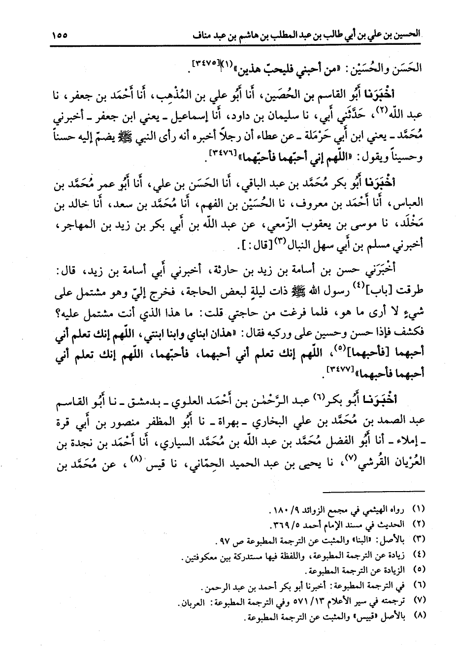 [3475] أخبرنا أبو القاسم بن الحصين أنا أبو علي بن المذهب أنا احمد بن جعفر نا عبد الله حدثني أبي نا سليمان بن داود أنا إسماعيل يعني ابن جعفر أخبرني محمد يعني ابن أبي حرملة عن عطاء أن رجلا أخبره أنه رأى النبي (صلى الله عليه وسلم) يضم إليه حسنا وحسينا ويقول اللهم إني أحبهما فأحبهما أخبرنا أبو بكر محمد بن عبد الباقي أنا الحسن بن علي أنا أبو عمر محمد بن العباس أنا أحمد بن معروف نا الحسين بن الفهم أنا محمد بن سعد أنا خالد بن مخلد نا موسى بن يعقوب الزمعي عن عبد الله بن أبي بكر بن زيد بن المهاجر أخبرني مسلم بن أبي سهل النبال قال أخبرني حسن بن أسامة بن زيد بن حارثة أخبرني أبي أسامة بن زيد قال طرقت باب رسول الله (صلى الله عليه وسلم) ذات ليلة لبعض الحاجة فخرج إلي وهو مشتمل على شئ لا أرى ما هو فلما فرغت من حاجتي قلت ما هذا الذي أنت مشتمل عليه فكشف فإذا حسن وحسين على وركيه فقال هذان ابناي وابنا ابنتي اللهم إنك تعلم أني أحبهما فأحبهما اللهم إنك تعلم أني أحبهما فأحبهما اللهم إنك تعلم أني أحبهما فأحبهما أخبرنا أبو بكر عبد الرحمن بن أحمد العلوي بدمشق نا أبو القاسم عبد الصمد بن محمد بن علي البخاري بهراة نا أبو المظفر منصور بن أبي قرة إملاء أنا أبو الفضل محمد بن عبد الله بن محمد السياري أنا احمد بن نجدة بن العريان القرشي نا يحيى بن عبد الحميد الحماني نا قيس عن محمد بن