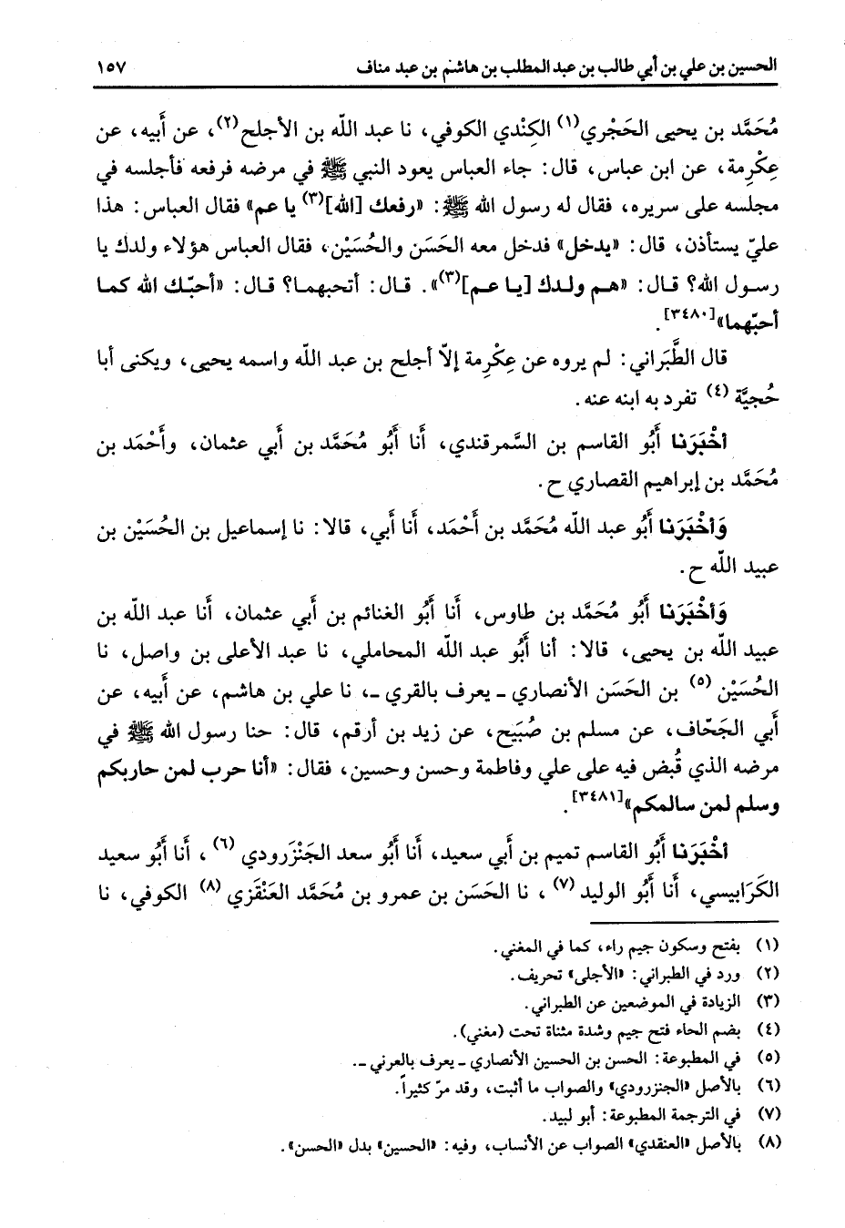محمد بن يحيى الحجري الكندي الكوفي نا عبد الله بن الأجلح عن أبيه عن عكرمة عن ابن عباس قال جاء العباس يعود النبي (صلى الله عليه وسلم) في مرضه فرفعه فأجلسه في مجلسه على سريره فقال له رسول الله (صلى الله عليه وسلم) رفعك الله يا عم فقال العباس هذا علي يستأذن قال يدخل فدخل معه الحسن والحسين فقال العباس هؤلاء ولدك يا رسول الله قال هم ولدك يا عم قال أتحبهما قال أحبك الله كما أحبهما قال الطبراني لم يروه عن عكرمة إلا أجلح بن عبد الله واسمه يحيى ويكنى أبا حجية تفرد به ابنه عنه أخبرنا أبو القاسم بن السمرقندي أنا أبو محمد بن أبي عثمان وأحمد بن محمد بن إبراهيم القصاري وأخبرنا أبو عبد الله محمد بن أحمد أنا أبي قالا نا إسماعيل بن الحسين بن عبيد الله وأخبرنا أبو محمد بن طاوس أنا أبو الغنائم بن أبي عثمان أنا عبد الله بن عبيد الله بن يحيى قالا أنا أبو عبد الله المحاملي نا عبد الأعلى بن واصل نا الحسين بن الحسن الأنصاري يعرف بالقري نا علي بن هاشم عن أبيه عن أبي الجحاف عن مسلم بن صبيح عن زيد بن أرقم قال حنا رسول الله (صلى الله عليه وسلم) في مرضه الذي قبض فيه على علي وفاطمة وحسن وحسين فقال أنا حرب لمن حاربكم وسلم لمن سالمكم أخبرنا أبو القاسم تميم بن أبي سعيد أنا أبو سعد الجنزرودي أنا أبو سعيد الكرابيسي أنا أبو الوليد نا الحسن بن عمرو بن محمد العنقزي الكوفي نا