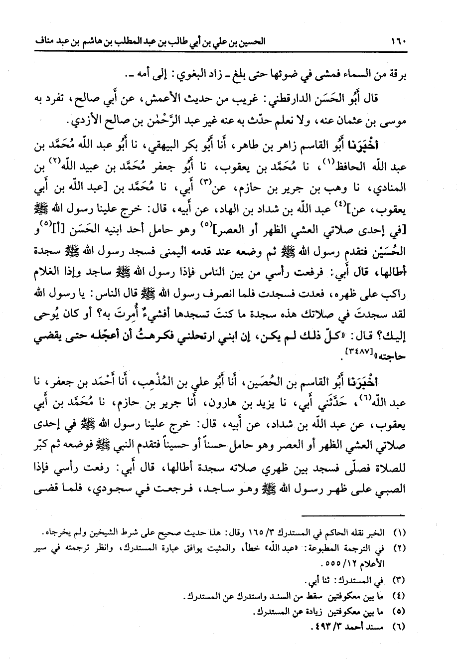 برقة من السماء فمشى في ضوئها حتى بلغ زاد البغوي إلى أمه قال أبو الحسن الدارقطني غريب من حديث الأعمش عن أبي صالح تفرد به موسى بن عثمان عنه ولا نعلم حدث به عنه غير عبد الرحمن بن صالح الأزدي أخبرنا أبو القاسم زاهر بن طاهر أنا أبو بكر البيهقي نا أبو عبد الله محمد بن عبد الله الحافظ (1) نا محمد بن يعقوب نا أبو جعفر محمد بن عبيد الله (2) بن المنادي نا وهب بن جرير بن حازم عن (3) أبي نا محمد بن عبد الله بن أبي يعقوب عن (4) عبد الله بن شداد بن الهاد عن أبيه قال خرج علينا رسول الله (صلى الله عليه وسلم) في إحدى صلاتي العشي الظهر أو العصر (5) وهو حامل أحد ابنيه الحسن [أ] (5) والحسين فتقدم رسول الله (صلى الله عليه وسلم) ثم وضعه عند قدمه اليمنى فسجد رسول الله (صلى الله عليه وسلم) سجدة أطالها قال أبي فرفعت رأسي من بين الناس فإذا رسول الله (صلى الله عليه وسلم) ساجد وإذا الغلام راكب على ظهره فعدت فسجدت فلما انصرف رسول الله (صلى الله عليه وسلم) قال الناس يا رسول الله لقد سجدت في صلاتك هذه سجدة ما كنت تسجدها أفشئ أمرت به أو كان يوحى إليك قال كل ذلك لم يكن إن ابني ارتحلني فكرهت أن أعجله حتى يقضي حاجته أخبرنا أبو القاسم بن الحصين أنا أبو علي بن المذهب أنا أحمد بن جعفر نا عبد الله (6) حدثني أبي نا يزيد بن هارون أنا جرير بن حازم نا محمد بن أبي يعقوب عن عبد الله بن شداد عن أبيه قال خرج علينا رسول الله (صلى الله عليه وسلم) في إحدى صلاتي العشي الظهر أو العصر وهو حامل حسنا أو حسينا فتقدم النبي (صلى الله عليه وسلم) فوضعه ثم كبر للصلاة فصلى فسجد بين ظهري صلاته سجدة أطالها قال أبي رفعت رأسي فإذا الصبي على ظهر رسول الله (صلى الله عليه وسلم) وهو ساجد فرجعت في سجودي فلما قضى