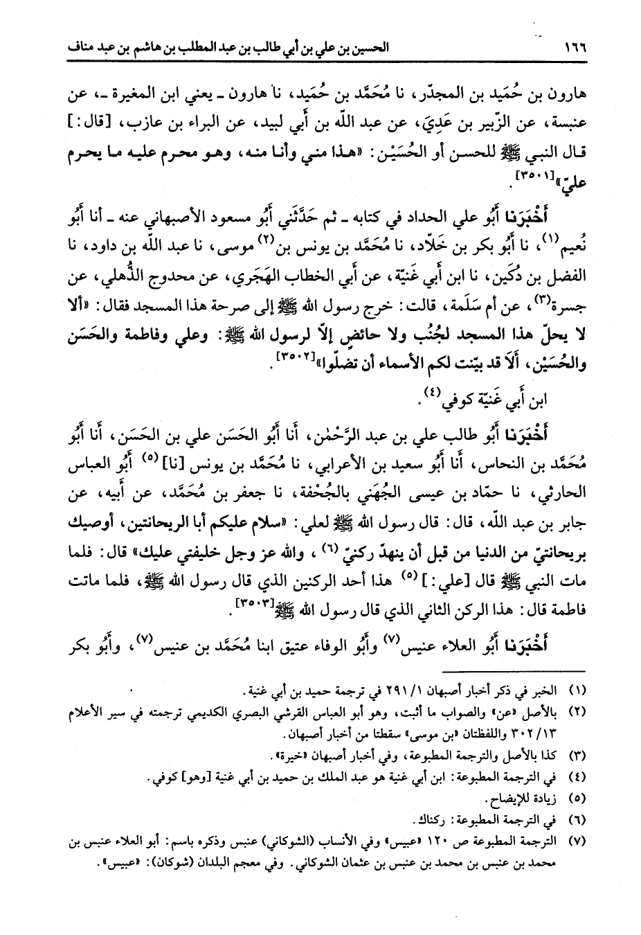 هارون بن حميد بن المجدر نا محمد بن حميد نا هارون يعني ابن المغيرة عن عنبسة عن الزبير بن عدي عن عبد الله بن أبي لبيد عن البراء بن عازب قال قال النبي (صلى الله عليه وسلم) للحسن أو الحسين هذا مني وأنا منه وهو محرم عليه ما يحرم علي أخبرنا أبو علي الحداد في كتابه ثم حدثني أبو مسعود الأصبهاني عنه أنا أبو نعيم (1) نا أبو بكر بن خلاد نا محمد بن يونس بن (2) موسى نا عبد الله بن داود نا الفضل بن دكين نا ابن أبي غنية عن أبي الخطاب الهجري عن محدوج الذهلي عن جسرة (3) عن أم سلمة قالت خرج رسول الله (صلى الله عليه وسلم) إلى صرحة هذا المسجد فقال ألا لا يحل هذا المسجد لجنب ولا حائض إلا لرسول الله (صلى الله عليه وسلم) وعلي وفاطمة والحسن والحسين ألا قد بينت لكم الأسماء أن تضلوا ابن أبي غنية كوفي (4) أخبرنا أبو طالب علي بن عبد الرحمن أنا أبو الحسن علي بن الحسن أنا أبو محمد بن النحاس أنا أبو سعيد بن الأعرابي نا محمد بن يونس نا (5) أبو العباس الحارثي نا حماد بن عيسى الجهني بالجحفة نا جعفر بن محمد عن أبيه عن جابر بن عبد الله قال قال رسول اله (صلى الله عليه وسلم) لعلي سلام عليكم أبا الريحانتين أوصيك بريحانتي من الدنيا من قبل أن ينهد ركني (6) والله عز وجل خليفتي عليك قال فلما مات النبي قال علي (5) هذا أحد الركنين الذي قال رسول الله (صلى الله عليه وسلم) فلما ماتت فاطمة قال هذا الركن الثاني الذي قال رسول الله (صلى الله عليه وسلم) أخبرنا أبو العلاء عنيس (7) وأبو الوفاء عتيق ابنا محمد بن عنيس (7) وأبو بكر