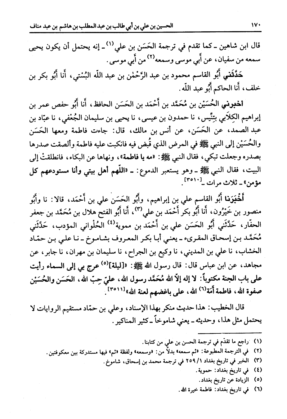 قال ابن شاهين كما تقدم في ترجمة الحسن بن علي إنه يحتمل أن يكون يحيى سمعه من سفيان عن أبي موسى وسمعه (2) من أبي موسى حدثني أبو القاسم محمود بن عبد الرحمن بن عبد الله البستي أنا أبو بكر بن خلف أنا الحاكم أبو عبد الله أخبرني الحسين بن محمد بن أحمد بن الحسن الحافظ أنا أبو حفص عمر بن إبراهيم الكلابي بتنيس نا حمدون بن عيسى نا يحيى بن سليمان الجعفي نا عباد بن عبد الصمد عن الحسن عن أنس بن مالك قال جاءت فاطمة ومعها الحسن والحسين إلى النبي (صلى الله عليه وسلم) في المرض الذي قبض فيه فانكبت عليه فاطمة وألصقت صدرها بصدره وجعلت تبكي فقال النبي (صلى الله عليه وسلم) مه يا فاطمة ونهاها عن البكاء فانطلقت إلى البيت فقال النبي (صلى الله عليه وسلم) وهو يستعبر الدموع اللهم أهل بيتي وأنا مستودعهم كل مؤمن ثلاث مرات أخبرنا أبو القاسم علي بن إبراهيم وأبو الحسن علي بن أحمد قالا نا وأبو منصور بن خيرون أنا أبو بكر أحمد بن علي (3) أنا أبو الفتح هلال بن محمد بن جعفر الحفار حدثني أبو الحسن علي بن أحمد بن مموية (4) الحلواني المؤدب حدثني محمد بن إسحاق المقرئ يعني أبا بكر المعروف بشاموخ نا علي بن حماد الخشاب نا علي بن المديني نا وكيع بن الجراح نا سليمان بن مهران نا جابر عن مجاهد عن ابن عباس قال قال رسول الله (صلى الله عليه وسلم) ليلة (5) عرج بي إلى السماء رأيت على باب الجنة مكتوبا لا إله إلا الله محمد رسول الله علي حب الله الحسن والحسين صفوة الله فاطمة أمة (6) الله على باغضهم لعنة الله قال الخطيب هذا حديث منكر بهذا الإسناد وعلي بن حماد مستقيم الروايات لا يحتمل مثل هذا وحديثه يعني شاموخا كثير المناكير