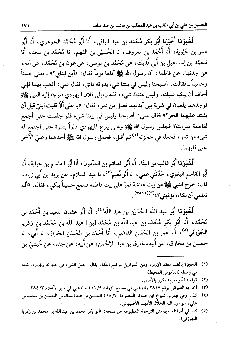 أخبرنا أخبرنا أبو بكر محمد بن عبد الباقي أنا أبو محمد الجوهري أنا أبو عمر بن حيوية أنا أحمد بن معروف نا الحسين بن الفهم نا محمد بن سعد أنا محمد بن إسماعيل بن أبي فديك عن محمد بن موسى عن عون بن محمد عن أمه عن جدتها عن فاطمة أن رسول الله (صلى الله عليه وسلم) أتاها يوما فقال أين ابناي يعني حسنا وحسينا فقالت أصبحنا وليس في بيتنا شئ يذوقه ذائق فقال علي أذهب بهما فإني أخاف أن يبكيا عليك وليس عندك شئ فذهب إلى فلان اليهودي فتوجه إليه النبي (صلى الله عليه وسلم) فوجدهما يلعبان في شربة بين أيديهما فضل من تمر فقال يا علي ألا قلبت ابني قبل أن يشتد عيهما الحر فقال علي أصبحنا وليس في بيتنا شئ فلو جلست حتى أجمع لفاطمة تمرات فجلس رسول الله (صلى الله عليه وسلم) وعلي ينزع لليهودي دلوا بتمرة حتى اجتمع له شئ من تمر فجعله في حجزته (1) ثم أقبل فحمل رسول الله (صلى الله عليه وسلم) أحدهما وعلي الآخر حتى قلبهما أخبرنا أبو غالب بن البنا أنا أبو الغنائم بن المأمون أنا أبو القاسم بن حبابة أنا أبو القاسم البغوي حدثني عمي نا أبو نعيم (2) نا عبد السلام عن يزيد بن أبي زياد قال خرج النبي (صلى الله عليه وسلم) من بيت عائشة فمر على بيت فاطمة فسمع حسينا يبكي فقال ألم تعلمي أن بكاءه يؤذيني؟) (3) أخبرنا أبو عبد الله الحسين بن عبد الله (4) أنا أبو عثمان سعيد بن أحمد بن محمد أنا أبو بكر محمد بن عبد الله بن محمد بن عبد الله بن محمد بن زكريا الجوزقي (5) أنا عمر بن الحسن القاضي أنا أحمد بن الحسن الخراز نا أبي نا حصين بن مخارق عن أبيه مخارق بن عبد الرحمن عن أبيه عن جده عن حبشي بن