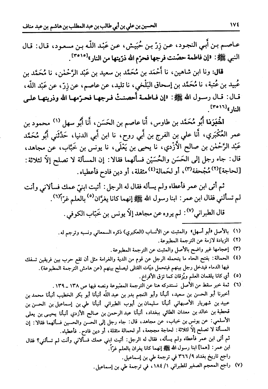 عاصم بن أبي النجود عن زر بن حبيش عن عبد الله بن مسعود قال قال النبي (صلى الله عليه وسلم) إن فاطمة حصنت فرجها فحرم الله ذريتها من النار قال ونا ابن شاهين نا أحمد بن محمد بن سعيد بن عبد الرحمن نا محمد بن عبيد بن عتبة نا محمد بن إسحاق البلخي نا تليد عن عاصم عن زر عن عبد الله قال قال رسول الله (صلى الله عليه وسلم) إن فاطمة أحصنت فرجها فحرمها الله وذريتها على النار أخبرنا أبو محمد بن طاوس أنا عاصم بن الحسن أنا أبو سهل (1) محمود بن عمر العكبري أنا علي بن الفرج بن أبي روح نا ابن أبي الدنيا حدثني أبو محمد عبد الرحمن بن صالح الأزدي نا يحيى بن يعلى نا يونس بن خباب عن مجاهد قال جاء رجل إلى الحسن والحسين فسألهما فقالا إن المسألة لا تصلح إلا لثلاثة لحاجة (2) مجحفة (3) أو لحمالة (3) مثقلة أو دين فادح فأعطياه ثم أتى ابن عمر فأعطاه ولم يسأله فقال له الرجل أتيت ابني عمك فسألاني وأنت لم تسألني فقال ابن عمر ابنا رسول الله (صلى الله عليه وسلم) إنهما كانا يغران (5) بالعلم غرا (6) قال الطبراني (7) لم يروه عن مجاهد إلا يونس بن خباب الكوفي