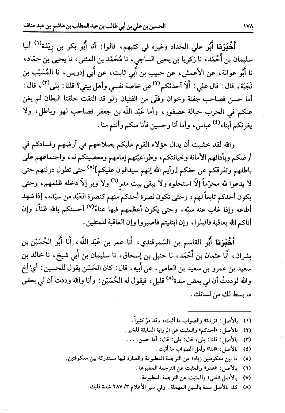 أخبرنا أبو علي الحداد وغيره في كتبهم قالوا أنا أبو بكر بن ريذة (1) أنبا أن سليمان بن أحمد نا زكريا بن يحيى الساجي نا محمد بن المثنى نا يحيى بن حماد نا أبو عوانة عن الأعمش عن حبيب بن أبي ثابت عن أبي إدريس نا المسيب بن نجبة قال قال علي ألا أحدثكم (2) عن خاصة نفسي وأهل بيتي قلنا بلى (3) قال أما حسن فصاحب جفنة وخوان وفتى من الفتيان ولو قد التقت حلقتا البطان لم يغن عنكم في الحرب حبالة عصفور وأما عبد الله بن جعفر فصاحب لهو وباطل ولا يغرنكم أبناء (4) عباس وأما أنا وحسين فأنا منكم وأنتم منا والله لقد خشيت أن يدال هؤلاء القوم عليكم بصلاحهم في أرضهم وفسادكم في أرضكم وبأدائهم الأمانة وخيانتكم وطواعيتهم إمامهم ومعصيتكم له واجتماعهم على باطلهم وتفرقكم عن حقكم وأيم الله إنهم سيدالون عليكم (5) حتى تطول دولتهم حتى لا يدعوا الله محرما إلا استحلوه ولا يبقى ببيت مدر (6) ولا وبر إلا دخله ظلمهم وحتى يكون أحدكم تابعا لهم وحتى تكون نصرة أحدكم منهم كنصرة العبد من سيده إذا شهد أطاعه وإذا غاب عنه سبه وحتى يكون أعظمهم فيها عناء (7) أحسنكم بالله ظنا وإن أتاكم الله بعاقبة فاقبلوا وإن ابتليتم فاصبروا وإن العاقبة للمتقين أخبرنا أبو القاسم بن السمرقندي أنا عمر بن عبد الله أنا أبو الحسين بن بشران أنا عثمان بن أحمد نا حنبل بن إسحاق نا سليمان بن أبي شيخ نا خالد بن سعيد بن عمرو بن سعيد بن العاص عن أبيه قال كان الحسن يقول للحسين أي أخ والله لوددت أن لي بعض سدة (8) قليل فيقول له الحسين وأنا والله وددت أن لي بعض ما بسط لك من لسانك