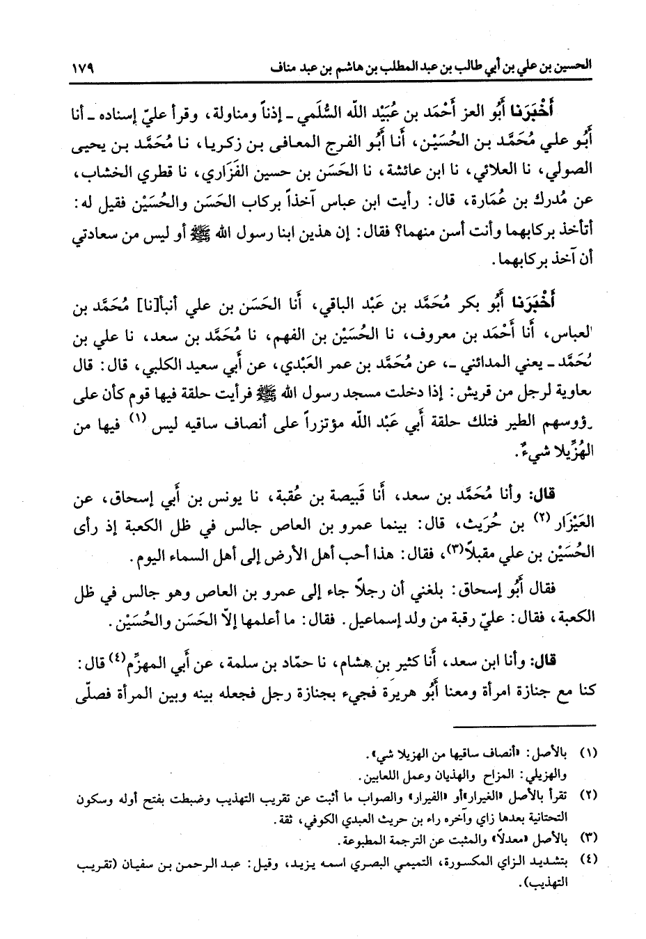 أخبرنا أبو العز أحمد بن عبيد الله السلمي إذنا ومناولة وقرأ علي إسناده أنا أبو علي محمد بن الحسين أنا أبو الفرج المعافى بن زكريا نا محمد بن يحيى الصولي نا العلائي نا ابن عائشة نا الحسن بن حسين الفزاري نا قطري الخشاب عن مدرك بن عمارة قال رأيت ابن عباس آخذا بركاب الحسن والحسين فقيل له أتأخذ بركابهما وأنت أسن منهما فقال إن هذين ابنا رسول الله (صلى الله عليه وسلم) أو ليس من سعادتي أن آخذ بركابهما أخبرنا أبو بكر محمد بن عبد الباقي أنا الحسن بن علي أنبأنا محمد بن العباس أنا أحمد بن معروف نا الحسين بن الفهم نا محمد بن سعد نا علي بن محمد يعني المدائني عن محمد بن عمر العبدي عن أبي سعيد الكلبي قال قال معاوية لرجل من قريش إذا دخلت مسجد رسول الله (صلى الله عليه وسلم) فرأيت حلقة فيها قوم كأن على رؤوسهم الطير فتلك حلقة أبي عبد الله مؤتزرا على أنصاف ساقيه ليس (1) فيها من الهزيلا شئ قال وأنا محمد بن سعد أنا قبيصة بن عقبة نا يونس بن أبي إسحاق عن العيزار (2) بن حريث قال بينما عمرو بن العاص جالس في ظل الكعبة إذ رأى الحسين بن علي مقبلا (3) فقال هذا أحب أهل الأرض إلى أهل السماء اليوم فقال أبو إسحاق بلغني أن رجلا جاء إلى عمرو بن العاص وهو جالس في ظل الكعبة فقال علي رقبة من ولد إسماعيل فقال ما أعلمها إلا الحسن والحسين قال وأنا ابن سعد أنا كثير بن هشام نا حماد ين سلمة عن أبي المهزم (4) قال كنا مع جنازة امرأة ومعنا أبو هريرة فجئ بجنازة رجل فجعله بينه وبين المرأة فصلى