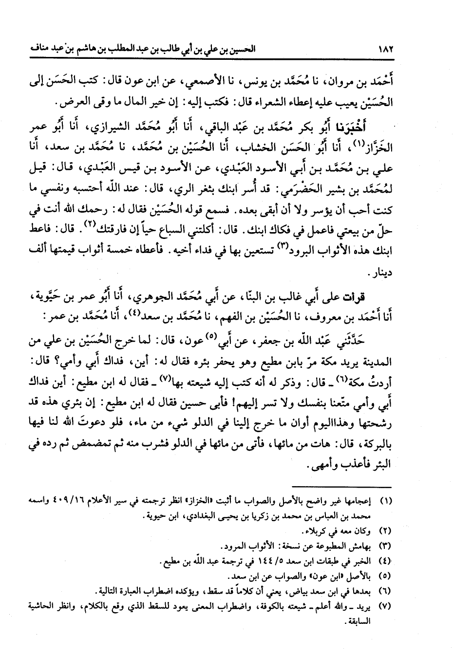 أحمد بن مروان نا محمد بن يونس نا الأصمعي عن ابن عون قال كتب الحسن إلى الحسين يعيب عليه إعطاء الشعراء قال فكتب إليه إن خير المال ما وقى العرض أخبرنا أبو بكر محمد بن عبد الباقي أنا أبو محمد الشيرازي أنا أبو عمر الخزاز (1) أنا أبو الحسن الخشاب أنا الحسين بن محمد نا محمد بن سعد أنا علي بن محمد بن أبي الأسود العبدي عن الأسود بن قيس العبدي قال قيل لمحمد بن بشير الحضرمي قد أسر ابنك بثغر الري قال عند الله أحتسبه ونفسي ما كنت أحب أن يؤسر ولا أن أبقى بعده فسمع قوله الحسين فقال له رحمك الله أنت في حل من بيعتي فاعمل في فكاك ابنك قال أكلتني السباع حيا إن فارقتك (2) قال فاعط ابنك هذه الأثواب البرود (3) تستعين بها في فداء أخيه فأعطاه خمسة أثواب قيمتها ألف دينار قرأت على أبي غالب بن البنا عن أبي محمد الجوهري أنا أبو عمر بن حيوية أنا أحمد بن معروف نا الحسين بن الفهم نا محمد بن سعد (4) أنا محمد بن عمر حدثني عبد الله بن جعفر عن أبي (4) عون قال لما خرج الحسين بن علي من المدينة يريد مكة مر بابن مطيع وهو يحفر بئره فقال له أين فداك أبي وأمي قال أردت مكة (6) قال وذكر له أنه كتب إليه شيعته بها (7) فقال له ابن مطيع أين فداك أبي وأمي متعنا بنفسك ولا تسر إليهم فأبى حسين فقال له ابن مطيع أن بئري هذه قد رشحتها وهذا اليوم أوان ما خرج إلينا في الدلو شئ من ماء فلو دعوت الله لنا فيها بالبركة قال هات من مائها فأتى من مائها في الدلو فشرب منه ثم تمضمض ثم رده في البئر فأعذب وأمهى