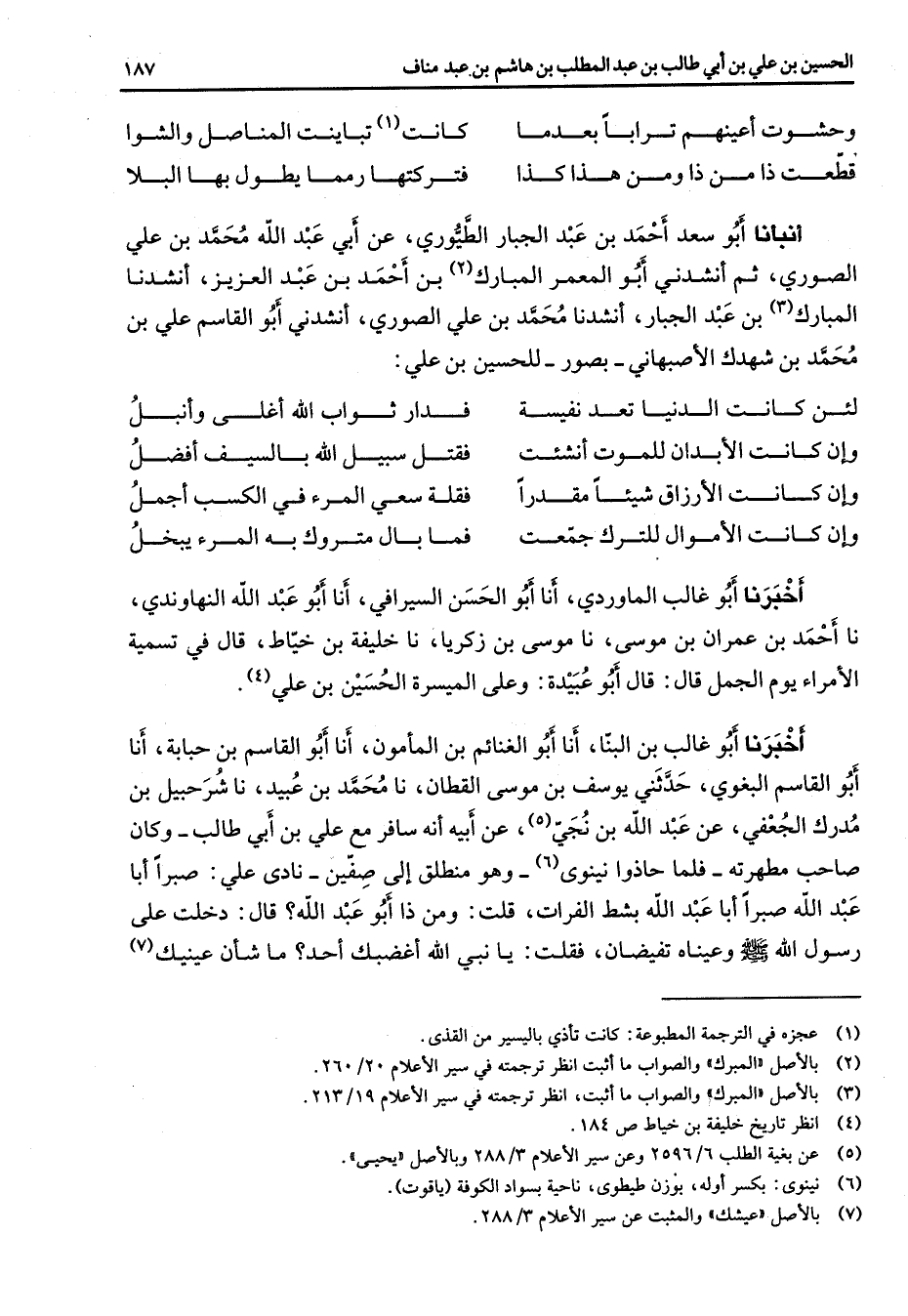وحشوت أعينهم ترابا بعدما * كانت (1) تباينت المناصل والشوا قطعت ذا من ذا ومن هذا كذا * فتركتها رمما يطول بها البلا أنبأنا أبو سعد أحمد بن عبد الجبار الطيوري عن أبي عبد الله محمد بن علي الصوري ثم أنشدني أبو المعمر المبارك (2) بن أحمد بن عبد العزيز أنشدنا المبارك (3) بن عبد الجبار أنشدنا محمد بن علي الصوري أنشدني أبو القاسم علي بن محمد بن شهدك الأصبهاني بصور للحسين بن علي لئن كانت الدنيا تعد نفيسة * فدار ثواب الله أغلى وأنبل وإن كانت الأبدان للموت أنشئت * فقتل سبيل الله بالسيف أفضل وإن كانت الأرزاق شيئا مقدرا * فقلة سعي المرء في الكسب أجمل وإن كانت الأموال للترك جمعت * فما بال متروك به المرء يبخل أخبرنا أبو غالب الماوردي أنا أبو الحسن السيرافي أنا أبو عبد الله النهاوندي نا أحمد بن عمران بن موسى نا موسى بن زكريا نا خليفة بن خياط قال في تسمية الأمراء يوم الجمل قال قال أبو عبيدة وعلى الميسرة الحسين بن علي (4) أخبرنا أبو غالب بن البنا أنا أبو الغنائم بن مأمون أنا أبو القاسم بن حبابة أنا أبو القاسم البغوي حدثني يوسف بن موسى القطان نا محمد بن عبيد نا شرحبيل بن مدرك الجعفي عن عبد الله بن نجي (5) عن أبيه أنه سافر مع علي بن أبي طالب وكان صاحب مطهرته فلما حاذوا نينوى (6) وهو منطلق إلى صفين نادى علي صبرا أبا عبد الله صبرا أبا عبد الله بشط الفرات قلت ومن ذا أبو عبد الله قال دخلت على رسول الله (صلى الله عليه وسلم) وعيناه تفيضان فقلت يا نبي الله أغضبك أحد ما شأن عينيك (7)