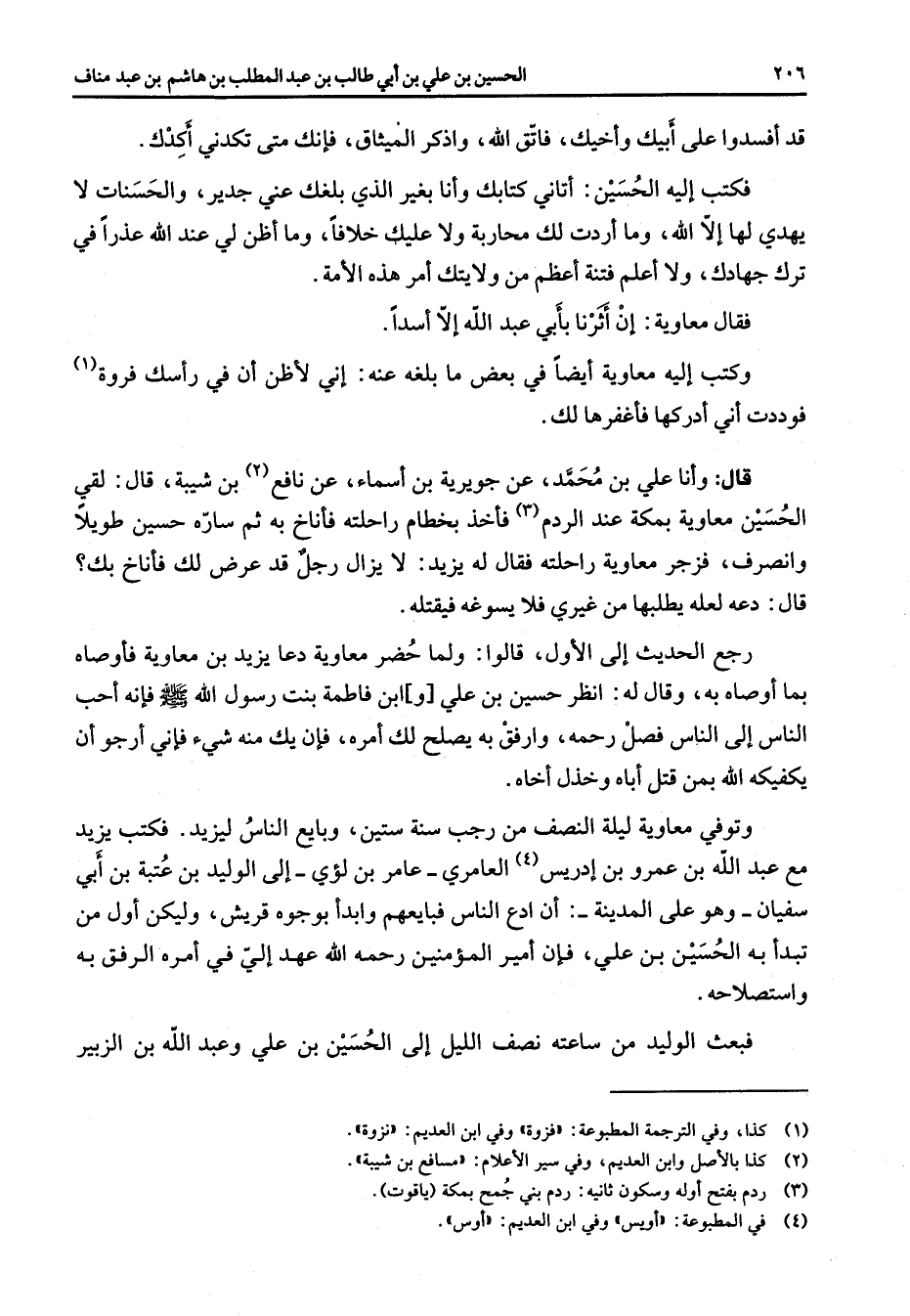 قد أفسدوا على أبيك وأخيك فاتق الله واذكر الميثاق فإنك متى تكدني أكدك فكتب إليه الحسين أتاني كتابك وأنا بغير الذي بلغك عني جدير والحسنات لا يهدي لها إلا الله وما أردت لك محاربة ولا عليك خلافا وما أظن لي عند الله عذرا في ترك جهادك ولا أعلم فتنة أعظم من ولايتك أمر هذه الأمة فقال معاوية إن أثرنا بأبي عبد الله إلا أسدا وكتب إليه معاوية أيضا في بعض ما بلغه عنه إني لأظن أن في رأسك فروة (1) فوددت أني أدركها فاغفرها لك قال وأنا علي بن محمد بن جويرية بن أسماء عن نافع (2) بن شيبة قال لقي الحسين معاوية بمكة عند الردم (3) فأخذ بحطام راحلته فأناخ به ثم ساره حسين طويلا وانصرف فزجر معاوية راحلته فقال له يزيد لا يزال رجل قد عرض لك فأناخ بك قال دعه لعله يطلبها من غيري فلا يسوغه فيقتله رجع الحديث إلى الأول قالوا ولما حضر معاوية دعا يزيد بن معاوية فأوصاه بما أوصاه به وقال له انظر حسين بن علي وابن فاطمة بنت رسول الله (صلى الله عليه وسلم) فإنه أحب الناس إلى الناس فصل رحمه وارفق به يصلح لك أمره فإن يك منه شئ فإني أرجو أن يكفيكه الله بمن قتل أباه وخذل أخاه وتوفي معاوية ليلة النصف من رجب سنة ستين وبايع الناس ليزيد فكتب يزيد مع عبد الله بن عمرو بن إدريس (4) العامري عامر بن لؤي إلى الوليد بن عتبة بن أبي سفيان وهو على المدينة أن ادع الناس فبايعهم وابدأ بوجوه قريش وليكن أول من تبدأ به الحسين بن علي فإن أمير المؤمنين رحمه الله عهد إلي في أمره الرفق به واستصلاحه فبعث الوليد من ساعته نصف الليل إلى الحسين بن علي وعبد الله بن الزبير