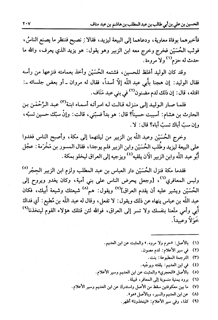 فأخبرهما بوفاة معاوية ودعاهما إلى البيعة ليزيد فقالا نصبح فننظر ما يصنع الناس فوثب الحسين فخرج وخرج معه ابن الزبير وهو يقول هو يزيد الذي يعرف والله ما حدث له ح 8 زم (1) ولا مروءة وقد كان الوليد أغلظ للحسين فشتمه الحسين وأخذ بعمامته فنزعها من رأسه فقال الوليد إن هجنا بأبي عبد الله إلا أسدا فقال له مروان أو بعض جلسائه اقتله قال إن ذلك لدم مضنون (2) في بني عبد مناف فلما صار الوليد إلى منزله قالت له امرأته أسماء ابنة (3) عبد الرحمن بن الحارث بن هشام أسببت حسينا قال هو بدأ فسبني قالت وإن سبك حسين تسبه وإن سب أباك تسب أباه قال لا وخرج الحسين وعبد الله بن الزبير من ليلتهما إلى مكة وأصبح الناس فغدوا على البيعة ليزيد وطلب الحسين وابن الزبير فلم يوجدا فقال المسور بن مخرمة عجل أبو عبد الله وابن الزبير الآن يلقيه (4) ويزجيه إلى العراق ليخلو بمكة فقدما مكة فنزل الحسين دار العباس بن عبد المطلب ولزم ابن الزبير الحجر (5) ولبس المعافري (6) وجعل يحرض الناس على بني أمية وكان يغدو ويروح إلى الحسين ويشير عليه أن يقدم العراق (7) ويقول هم (8) شيعتك وشيعة أبيك فكان عبد الله بن عباس ينهاه عن ذلك ويقول لا تفعل وقال له عبد الله بن مطيع أي فداك أبي وأمي متعنا بنفسك ولا تسر إلى العراق فوالله لئن قتلك هؤلاء القوم ليتخذنا (9) خولا وعبيدا