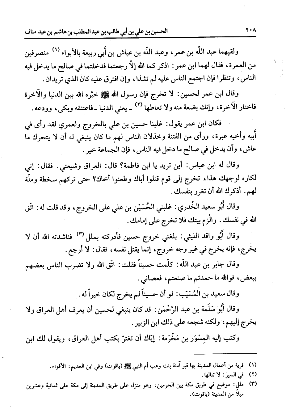 ولقيهما عبد الله بن عمر وعبد الله بن عياش بن أبي ربيعة بالأبواء (1) منصرفين من العمرة فقال لهما ابن عمر اذكر كما الله إلا رجعتما فدخلتما في صالح ما يدخل فيه الناس وتنظرا فإن اجتمع الناس عليه لم تشذا وإن افترق عليه كان الذي تريدان وقال ابن عمر لحسين لا تخرج فإن رسول الله (صلى الله عليه وسلم) خيره الله بين الدنيا والآخرة فاختار الآخرة وإنك بضعة منه ولا تعاطها (2) يعني الدنيا فاعتنقه وبكى وودعه فكان ابن عمر يقول غلبنا حسين بن علي بالخروج ولعمري لقد رأى في أبيه وأخيه عبرة ورأى من الفتنة وخذلان الناس لهم ما كان ينبغي له أن لا يتحرك ما عاش وأن يدخل في صالح ما دخل فيه الناس فإن الجماعة خير وقال له ابن عباس أين تريد يا ابن فاطمة قال العراق وشيعتي فقال إني لكاره لوجهك هذا تخرج إلى قوم قتلوا أباك وطعنوا أخاك حتى تركهم سخطة وملة لهم أذكرك الله أن تغرر بنفسك وقال أبو سعيد الخدري غلبني الحسين بن علي على الخروج وقد قلت له اتق الله في نفسك والزم بيتك فلا تخرج على إمامك وقال أبو واقد الليثي بلغني خروج حسين فأدركته بملل (3) فناشدته الله أن لا يخرج فإنه يخرج في غير وجه خروج إنما يقتل نفسه فقال لا أرجع وقال جابر بن عبد الله كلمت حسينا فقلت اتق الله ولا تضرب الناس بعضهم ببعض فوالله ما حمدتم ما صنعتم فعصاني وقال سعيد بن المسيب لو أن حسينا لم يخرج لكان خيرا له وقال أبو سلمة بن عبد الرحمن قد كان ينبغي لحسين أن يعرف أهل العراق ولا يخرج إليهم ولكنه شجعه على ذلك ابن الزبير وكتب إليه المسور بن مخرمة إياك أن تغتر بكتب أهل العراق ويقول لك ابن