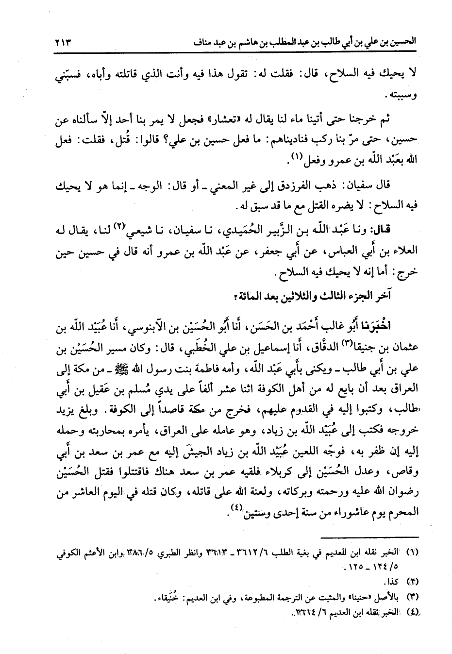لا يحيك فيه السلاح قال فقلت له تقول هذا فيه وأنت الذي قاتلته وأباه فسبني وسببته ثم خرجنا حتى أتينا ماء لنا يقال له تعشار فجعل لا يمر بنا أحد إلا سألناه عن حسين حتى مر بنا ركب فناديناهم ما فعل حسين بن علي قالوا قتل فقلت فعل الله بعبد الله بن عمرو وفعل (1) قال سفيان ذهب الفرزدق إلى غير المعني أو قال الوجه إنما هو لا يحيك فيه السلاح لا يضره القتل مع ما قد سبق له قال ونا عبد الله بن الزبير الحميدي نا سفيان نا شيعي (2) لنا يقال له العلاء بن أبي العباس عن أبي جعفر عن عبد الله بن عمرو أنه قال في حسين حين خرج أما إنه لا يحبك فيه السلاح آخر الجزء الثالث والثلاثين يعد المائة أخبرنا أبو غالب أحمد بن الحسن أنا أبو الحسين بن الآبنوسي أنا عبيد الله بن عثمان بن جنيقا (3) الدقاق أنا إسماعيل بن علي الخطبي قال وكان مسير الحسين بن علي بن أبي طالب ويكنى بأبي عبد الله وأمه فاطمة بنت رسول الله (صلى الله عليه وسلم) من مكة إلى العراق بعد أن بايع له من أهل الكوفة اثنا عشر ألفا على يدي مسلم بن عقيل بن أبي طالب وكتبوا إليه في القدوم عليهم فخرج من مكة قاصدا إلى الكوفة وبلغ يزيد خروجه فكتب إلى عبيد الله بن زياد وهو عامله على العراق يأمره بمحاربته وحمله إليه إن ظفر به فوجه اللعين عبيد الله بن زياد الجيش إليه مع عمر بن سعد بن أبي وقاص وعدل الحسين إلى كربلاء فلقيه عمر بن سعد هناك فاقتتلوا فقتل الحسين رضوان الله عليه ورحمته وبركاته ولعنة الله على قاتله وكان قتله في اليوم العاشر من المحرم يوم عاشوراء من سنة إحدى وستين (4)