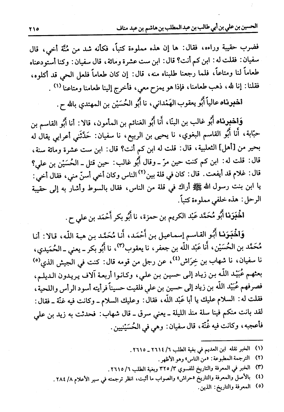 فضرب حقيبة وراءه فقال ها إن هذه مملوءة كتبا فكأنه شد من منة أخي قال سفيان فقلت له ابن كم أنت قال ابن ست عشرة ومائة قال سفيان وكنا أستودعناه طعاما لنا ومتاعا فلما رجعنا طلبناه منه قال إن كان طعاما فلعل الحي قد أكلوه فقلنا إنا لله ذهب طعامنا فإذا هو يمزح معي فأخرج إلينا طعامنا ومتاعنا (1) أخبرناه عاليا أبو يعقوب الهمداني نا أبو الحسين بن المهتدي بالله ح وأخبرناه أبو غالب بن البنا أنا أبو الغنائم بن المأمون قالا أنا أبو القاسم بن حبابة أنا أبو القاسم البغوي نا يحيى بن الربيع نا سفيان حدثني أعرابي يقال له بحير من أهل الثعلبية قال قلت له ابن كم أنت قال ابن ست عشرة ومائة سنة قال قلت له ابن كم كنت حين مر وقال أبو غالب حين قتل الحسين بن علي قال غلام قد أيفعت قال كان في قلة بين (2) الناس وكان أخي أسن مني فقال أخي يا ابن بنت رسول الله (صلى الله عليه وسلم) أراك في قلة من الناس فقال بالسوط وأشار به إلى حقيبة الرجل هذه خلفي مملوءة كتبا أخبرنا أبو محمد عبد الكريم بن حمزة نا أبو بكر أحمد بن علي ح وأخبرنا أبو القاسم إسماعيل بن أحمد أنا محمد بن هبة الله قالا أنا محمد بن الحسين أنا عبد الله بن جعفر نا يعقوب (3) نا أبو بكر يعني الحميدي نا سفيان نا شهاب بن خراش (4) عن رجل من قومه قال كنت في الجيش الذي (5) بعثهم عبيد الله بن زياد إلى حسين بن علي وكانوا أربعة آلاف يريدون الديلم فصرفهم عبيد الله بن زياد إلى حسين بن علي فلقيت حسينا فرأيته أسود الرأس واللحية فقلت له السلام عليك يا أبا عبد الله فقال وعليك السلام وكانت فيه غنة فقال لقد بانت منكم فينا سلة منذ الليلة يعني سرق قال شهاب فحدثت به زيد بن علي فأعجبه وكانت في غنة قال سفيان وهي في الحسينيين